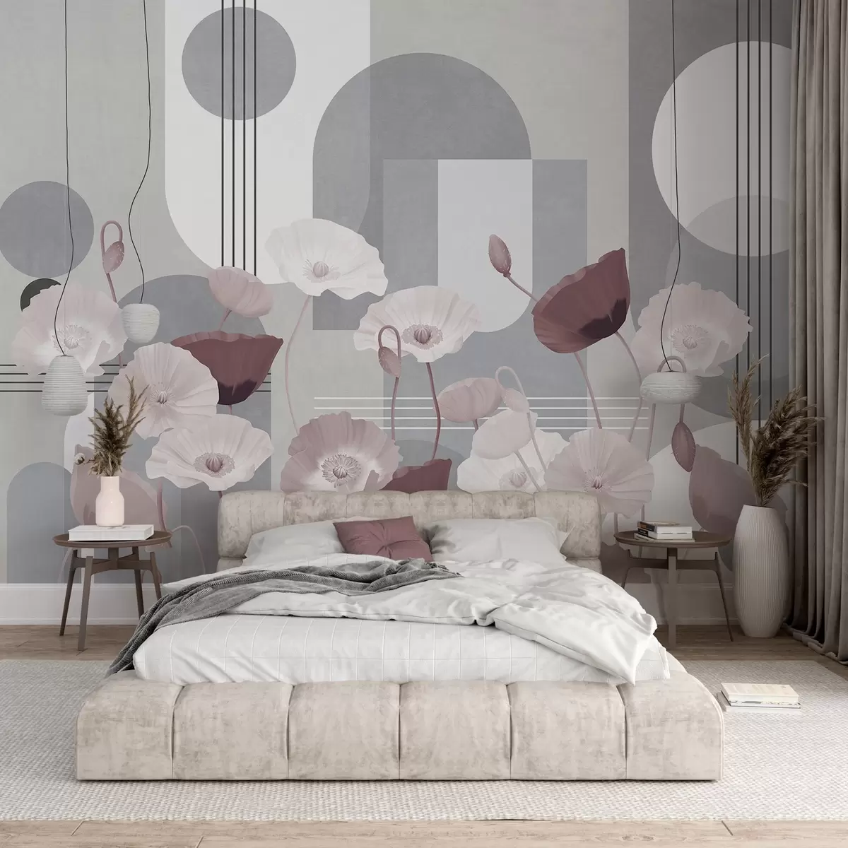 Τοιχογραφίες Παπαρούνες σε λευκό και γκρι χρώμα με γεωμετρικά σχήματα στο φόντο, κύκλους και τόξα, μινιμαλιστικό στυλ, απαλά χρώματα Nr. w09289v1
