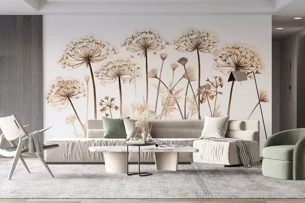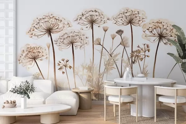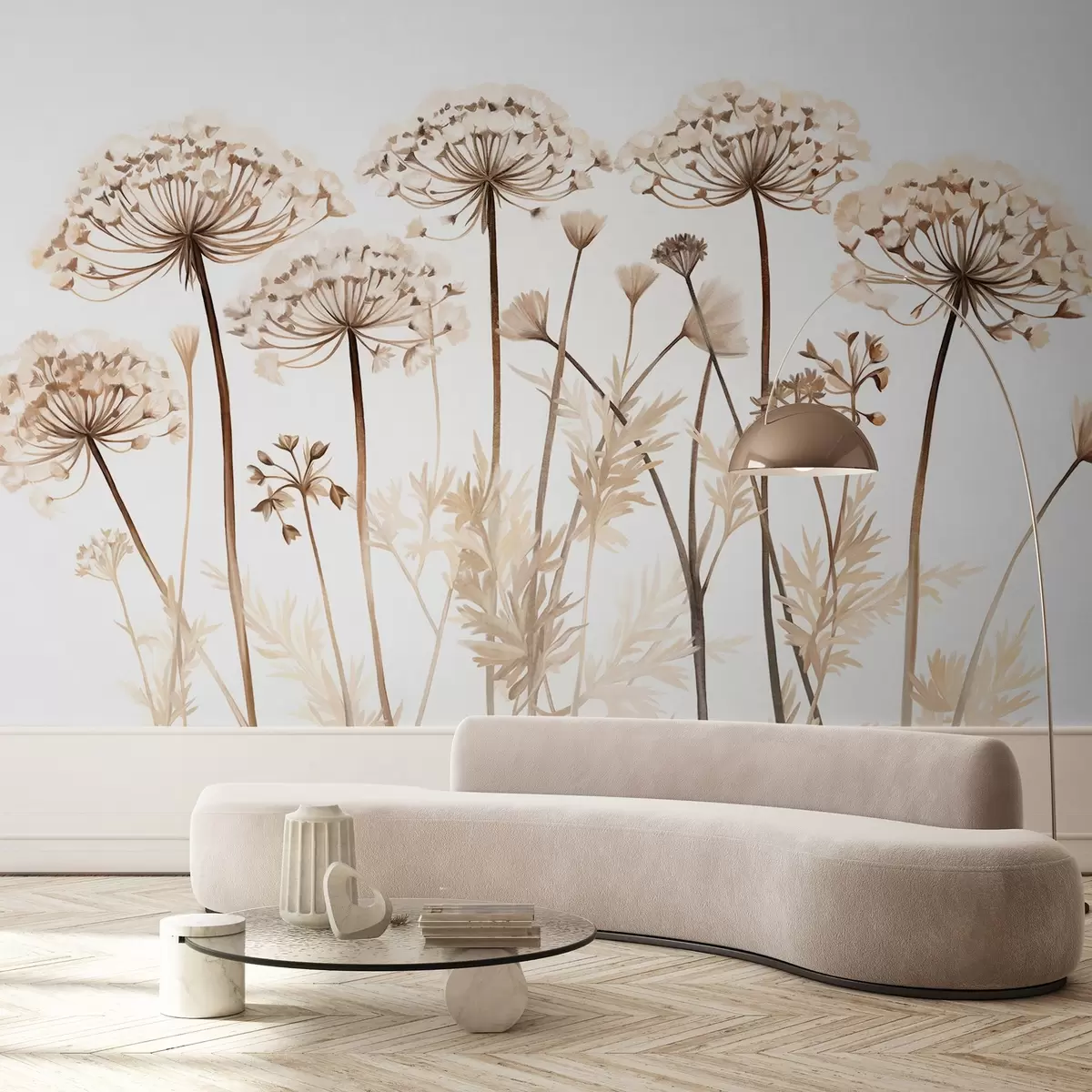 Τοιχογραφίες Queen Anne's Lace λουλούδια σε ένα πεδίο, υφή απομίμηση ζωγραφικής, καφέ, μπεζ και λευκή παλέτα χρωμάτων, βοτανική απεικόνιση Nr. w09294