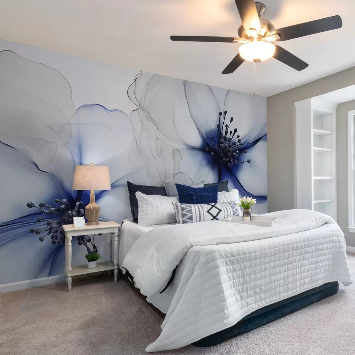 Τοιχογραφίες Δύο ημιδιαφανή μπλε λουλούδια με ορατούς στήμονες, επικαλυπτόμενα λεπτά πέταλα και απαλή υφή που ρέει Nr. w09295v1