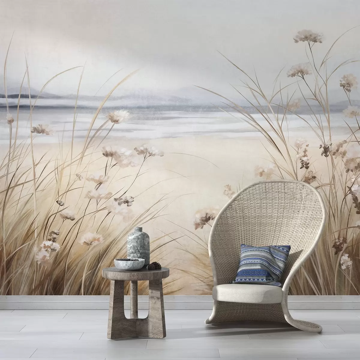 Τοιχογραφίες Ένα χωράφι με σιτάρι και λευκά λουλούδια σε πρώτο πλάνο, μια παραλία και ο ωκεανός στο φόντο, ουδέτερα παστέλ απαλά χρώματα Nr. w09298