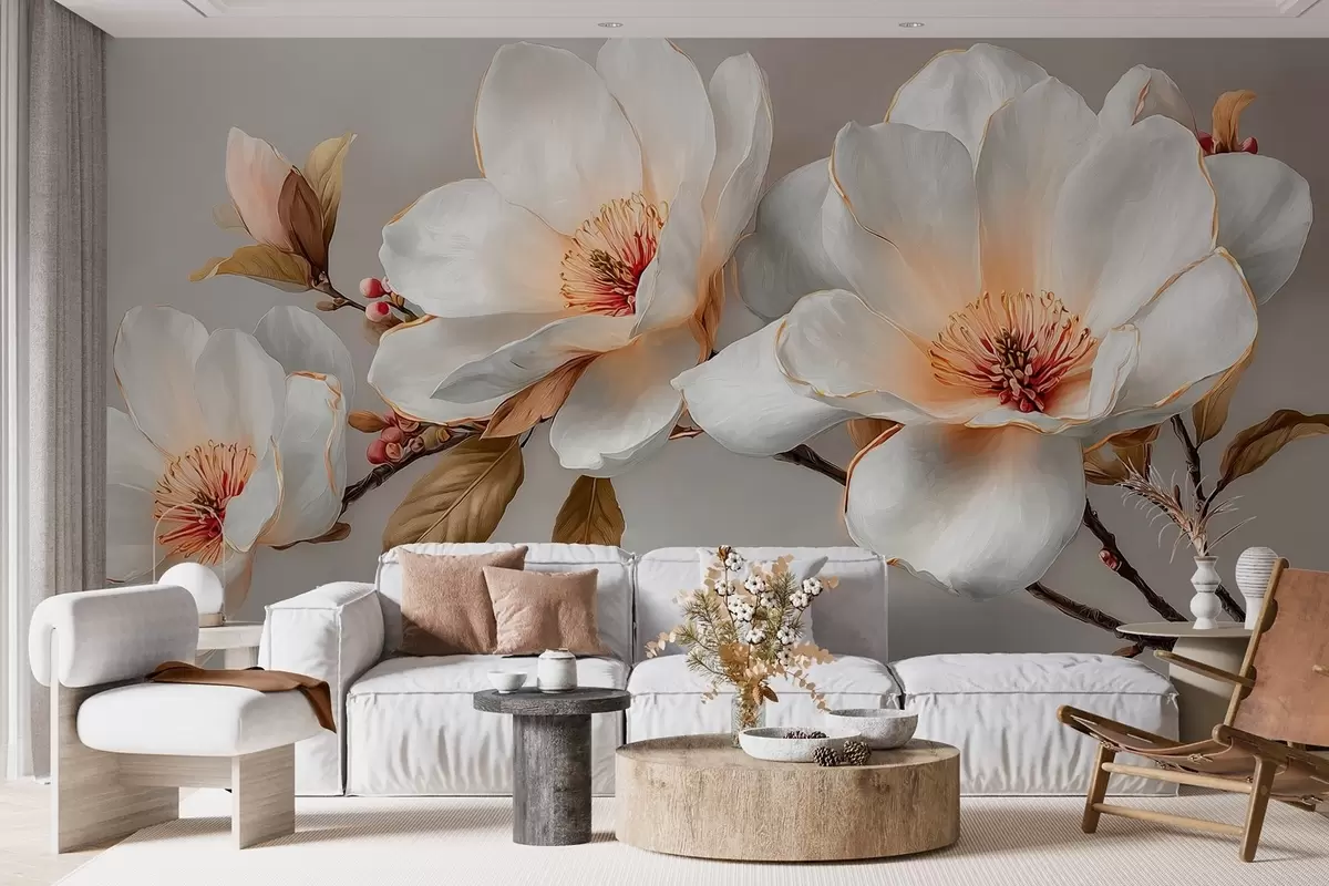 Τοιχογραφίες Λεπτά λουλούδια σε κλαδί σε παστέλ αποχρώσεις με πορτοκαλί κέντρα Nr. w09299