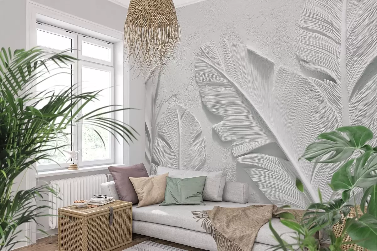 Τοιχογραφίες Γκρίζα φύλλα με υφή σε φόντο με ανάγλυφο από ψεύτικο γύψο Nr. w09307