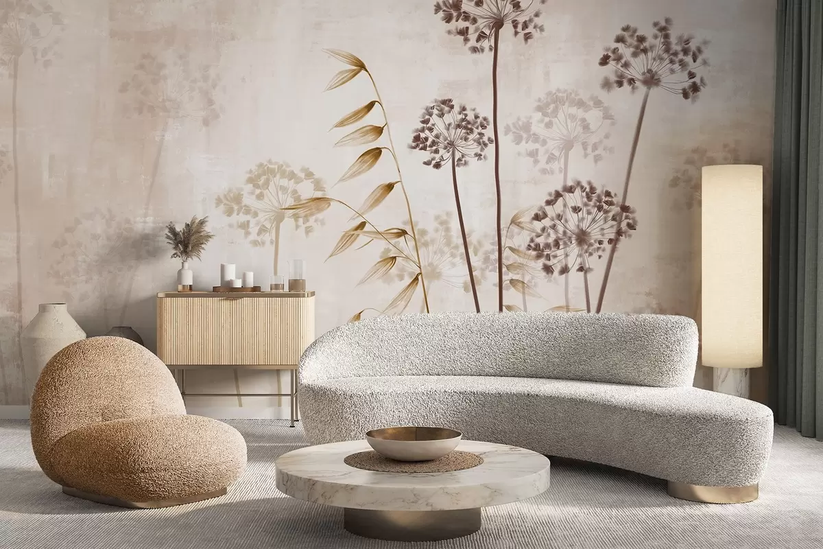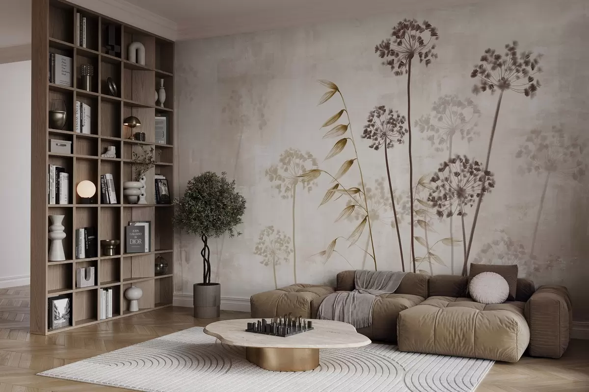Τοιχογραφίες Σχέδιο αποξηραμένων λουλουδιών με μακρύ μίσχο, μονόχρωμη παλέτα, σε υφή, ανοιχτό μπεζ φόντο, βοτανική εικονογράφηση Nr. w09314v1