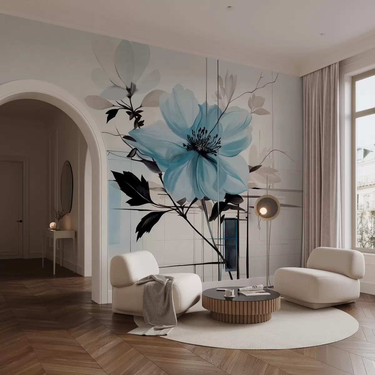 Τοιχογραφίες Αφηρημένη υφή μπλε λουλούδι με σκούρα φύλλα και κλαδιά, γεωμετρικά μινιμαλιστικά σχήματα και γραμμές σε απαλά χρώματα Nr. w09332