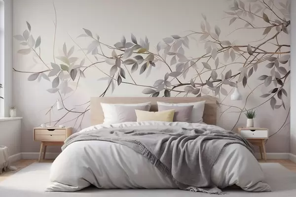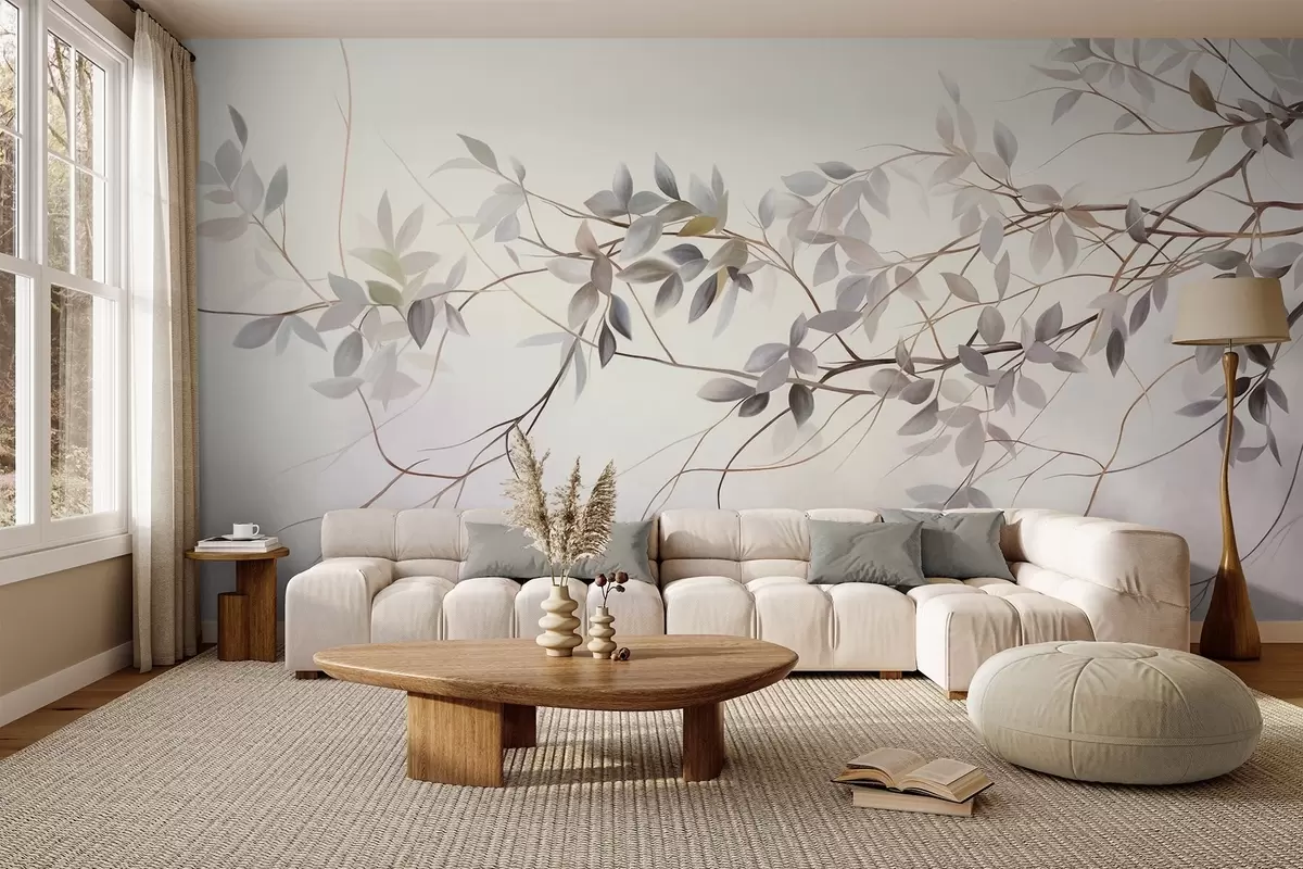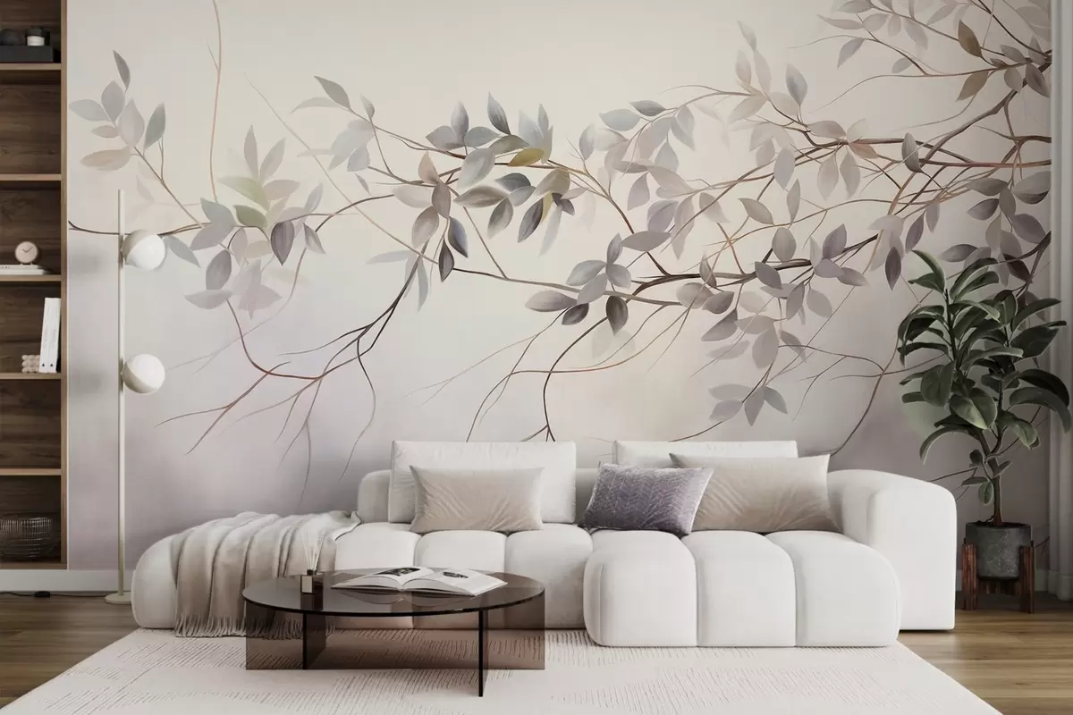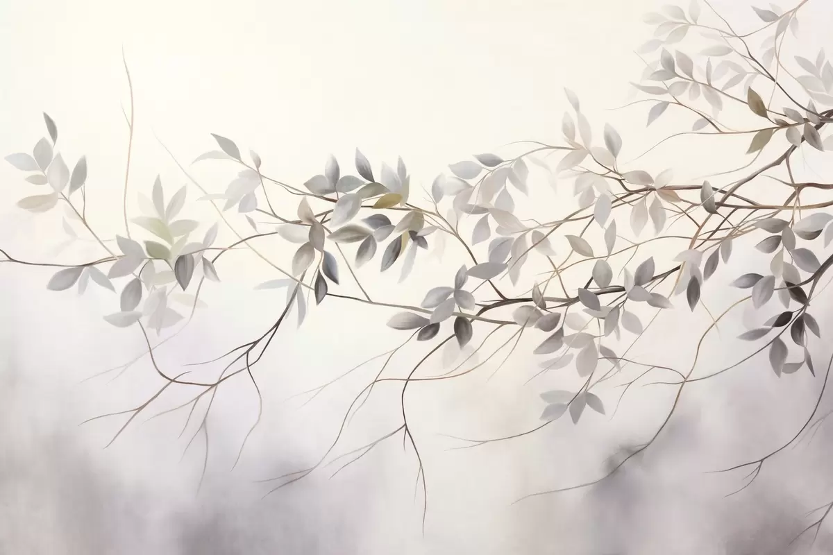 Τοιχογραφίες Λεπτά κλαδιά με απαλό γκρι, μοβ και πράσινο φύλλωμα σε απαλό, θολό φόντο Nr. w09336