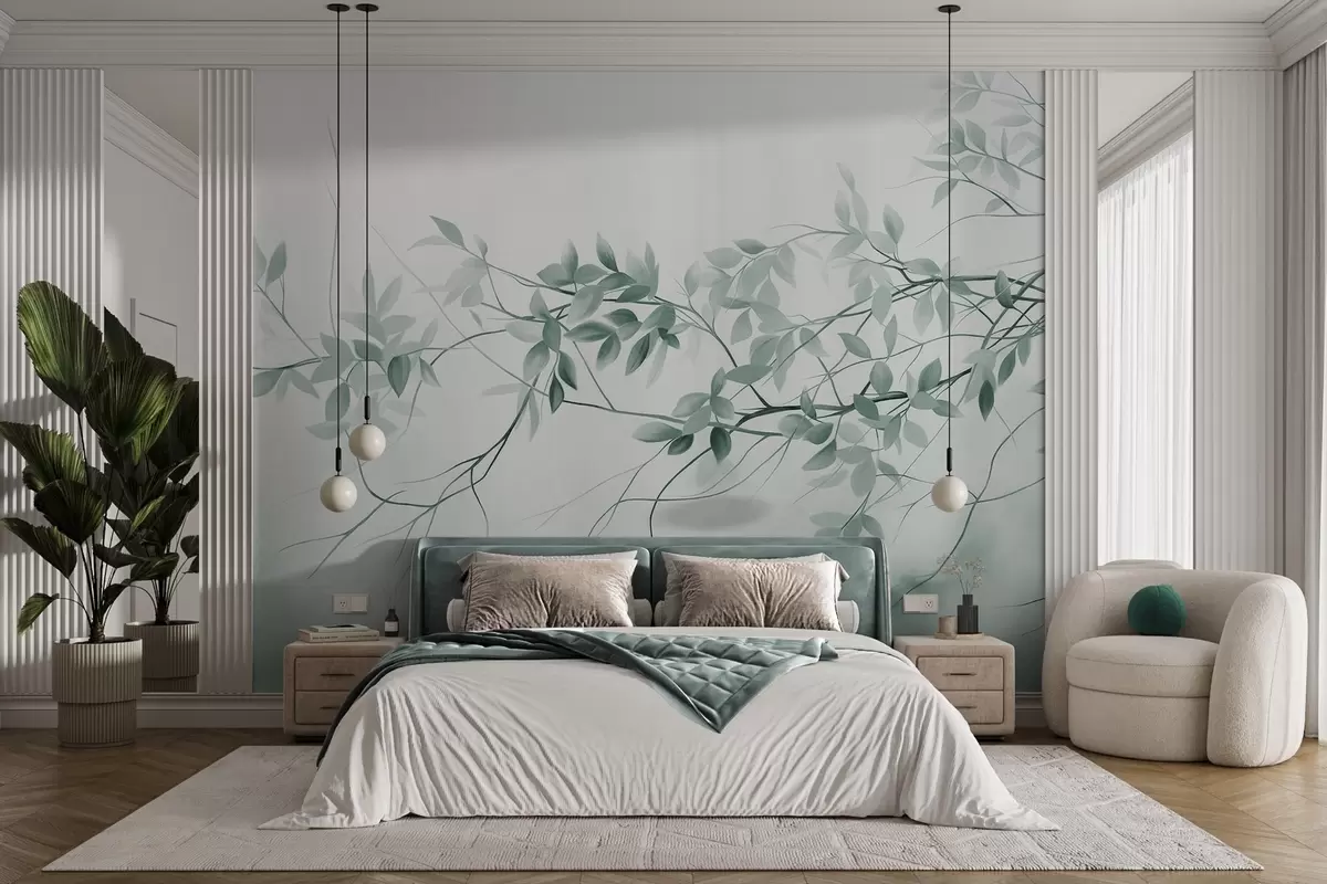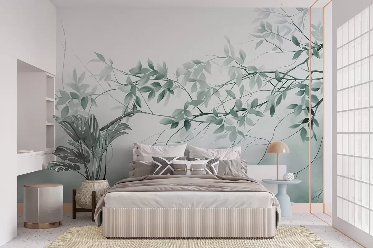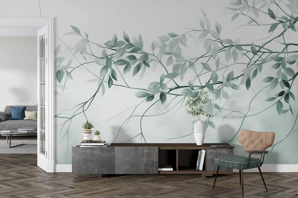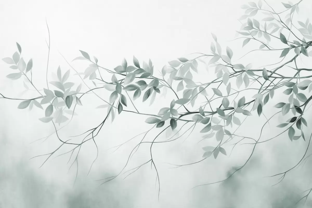 Τοιχογραφίες Λεπτά κλαδιά με απαλή υφή και φύλλα σε απαλούς τόνους του γκρι και του πράσινου, σε φόντο απαλό και θολωμένο. Nr. w09336v1