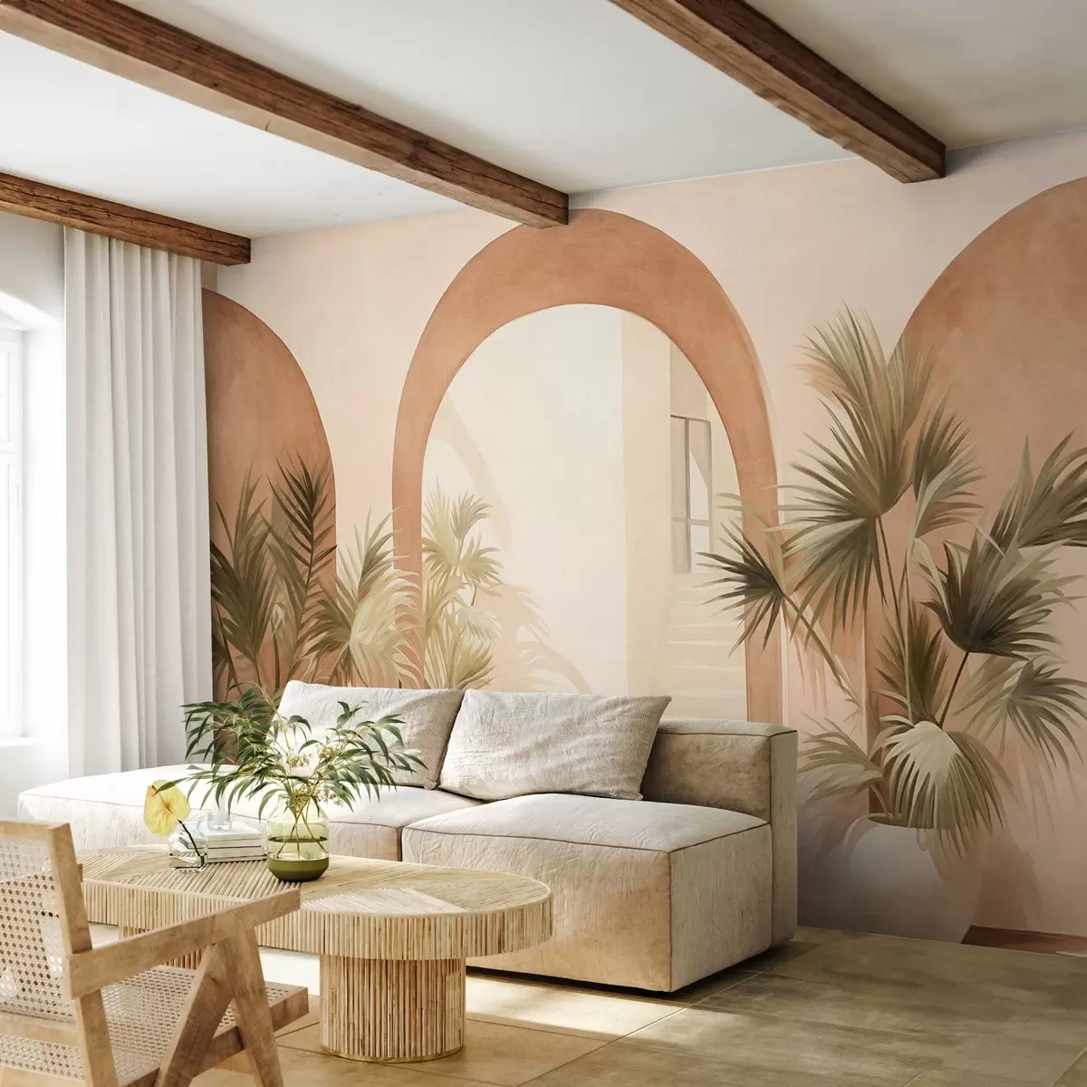 Τοιχογραφίες Καμάρες με υφή και φυτά σε γλάστρες, ανοιχτή μπεζ χρωματική παλέτα, μινιμαλιστικός σχεδιασμός, σκάλα στο φόντο Nr. w09339