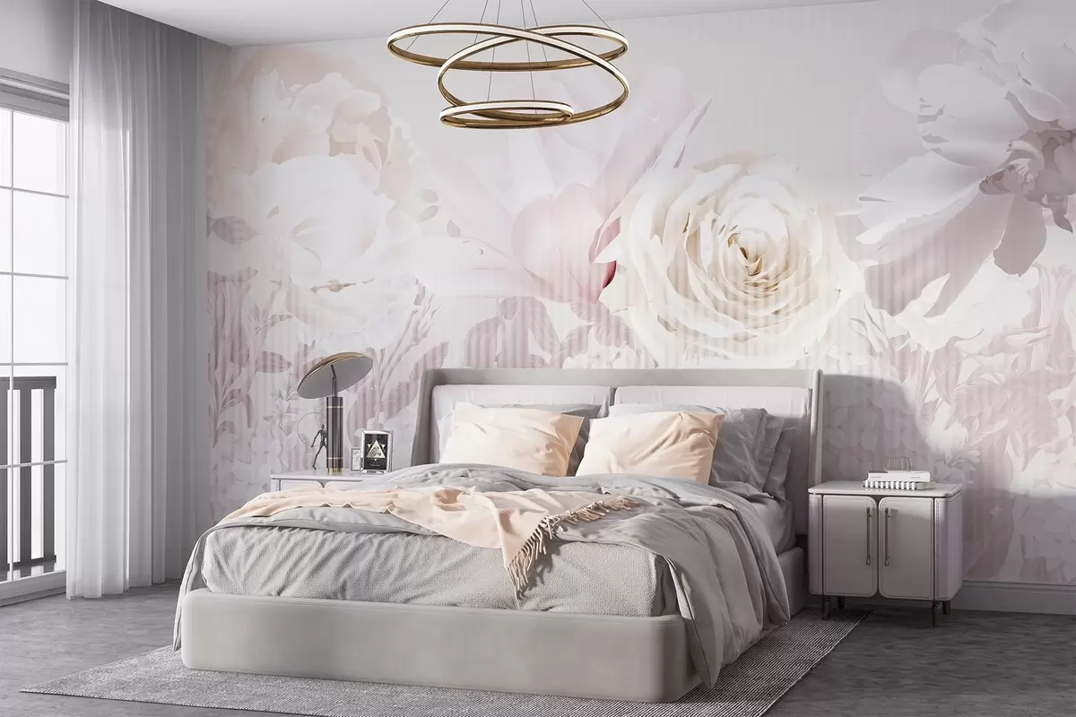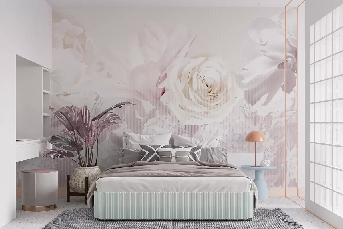 Τοιχογραφίες Σύνθεση λουλουδιών με τριαντάφυλλα, ορτανσίες και τουλίπες σε απαλές παστέλ αποχρώσεις του λευκού, ροζ και μπεζ, με ριγέ υφή Nr. w09340