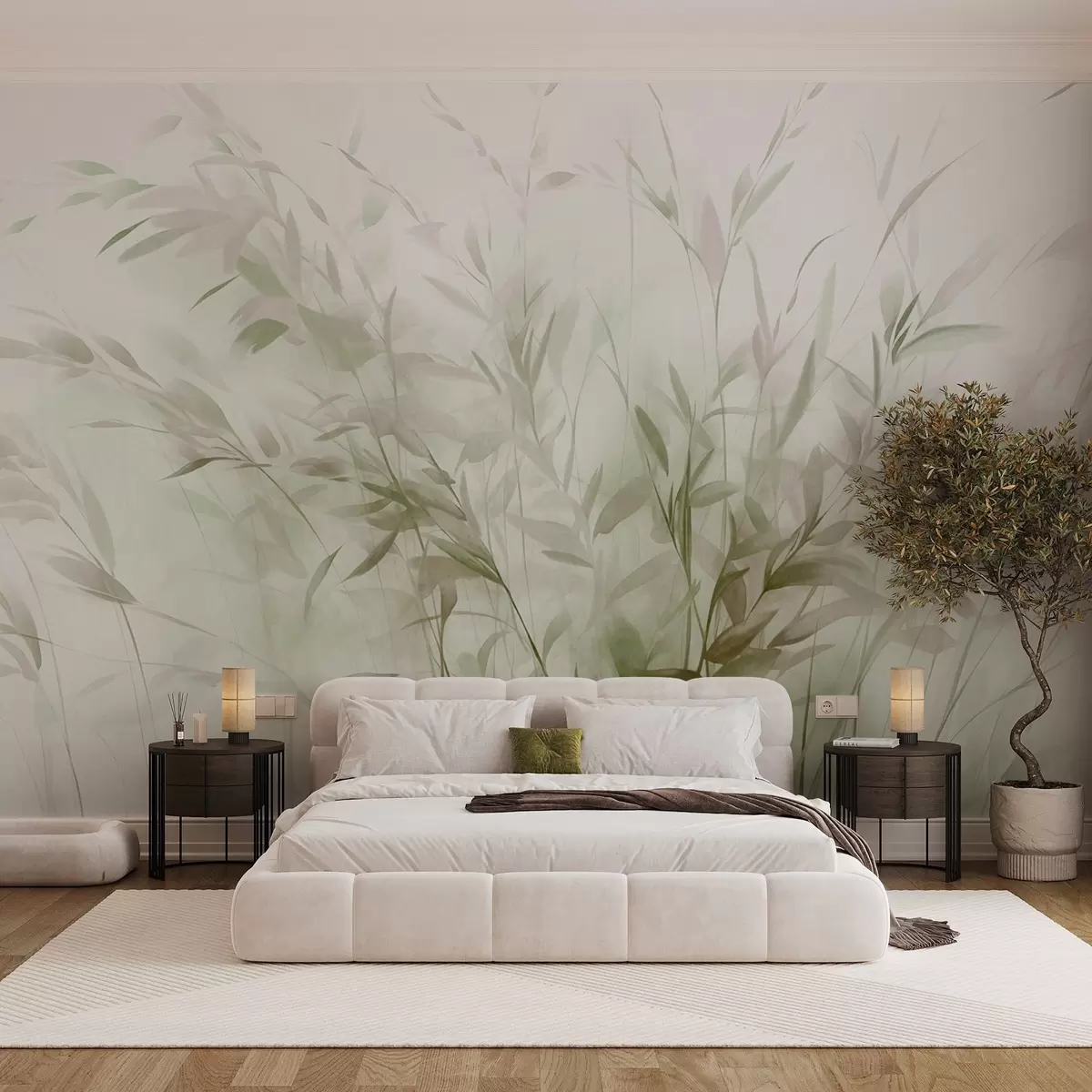 Τοιχογραφίες Γρασίδι και ζιζάνια με λεπτά φύλλα και μίσχους, ανοιχτό πράσινο και καφέ χρώματα, απαλές και ντελικάτες πινελιές, μινιμαλιστική εκτύπωση Nr. w09342
