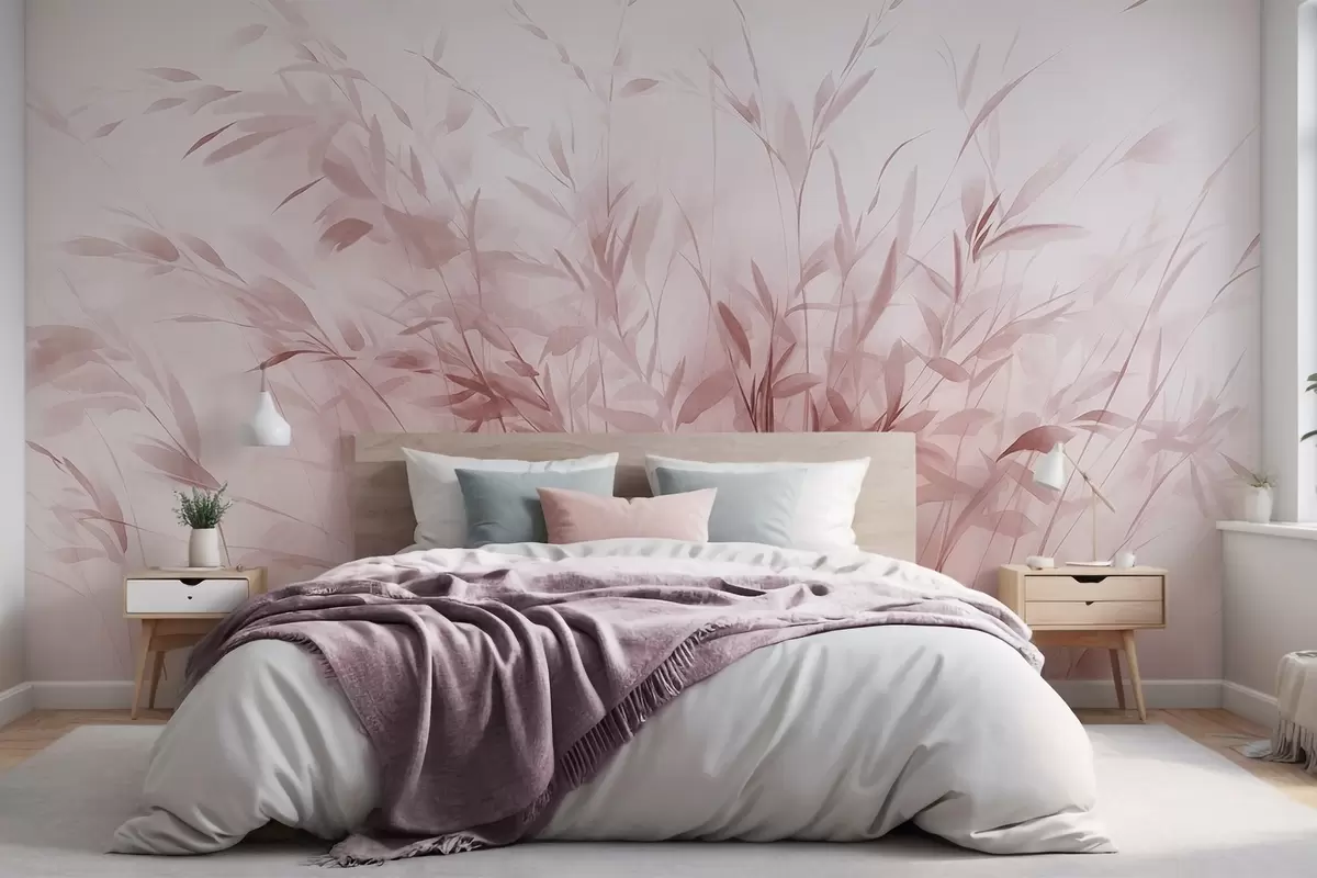 Τοιχογραφίες Γρασίδι και ζιζάνια με λεπτά φύλλα και μίσχους, ανοιχτό ροζ χρώμα, απαλές και ντελικάτες πινελιές, μινιμαλιστική εκτύπωση Nr. w09342v2