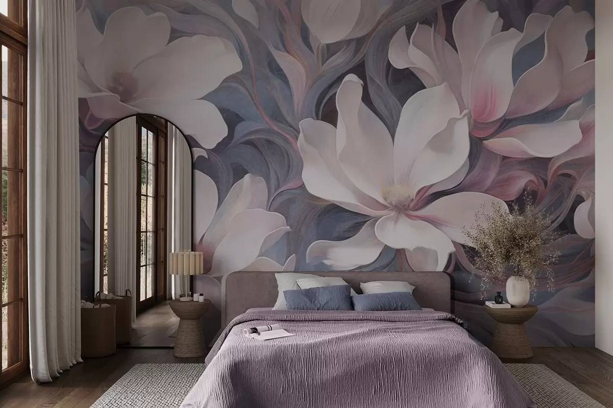 Τοιχογραφίες Ζωγραφική με λευκά άνθη μανόλιας με ροζ πινελιές, σε φόντο με στροβιλώδεις, απαλές μπλε και γκρι αποχρώσεις Nr. w09344