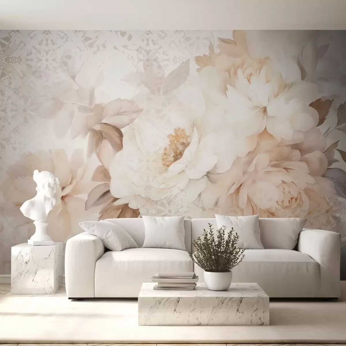 Τοιχογραφίες Μια ανθοσύνθεση από λευκές παιώνιες με μπεζ φύλλα, σε διακοσμητικό φόντο με vintage υφή Nr. w09345
