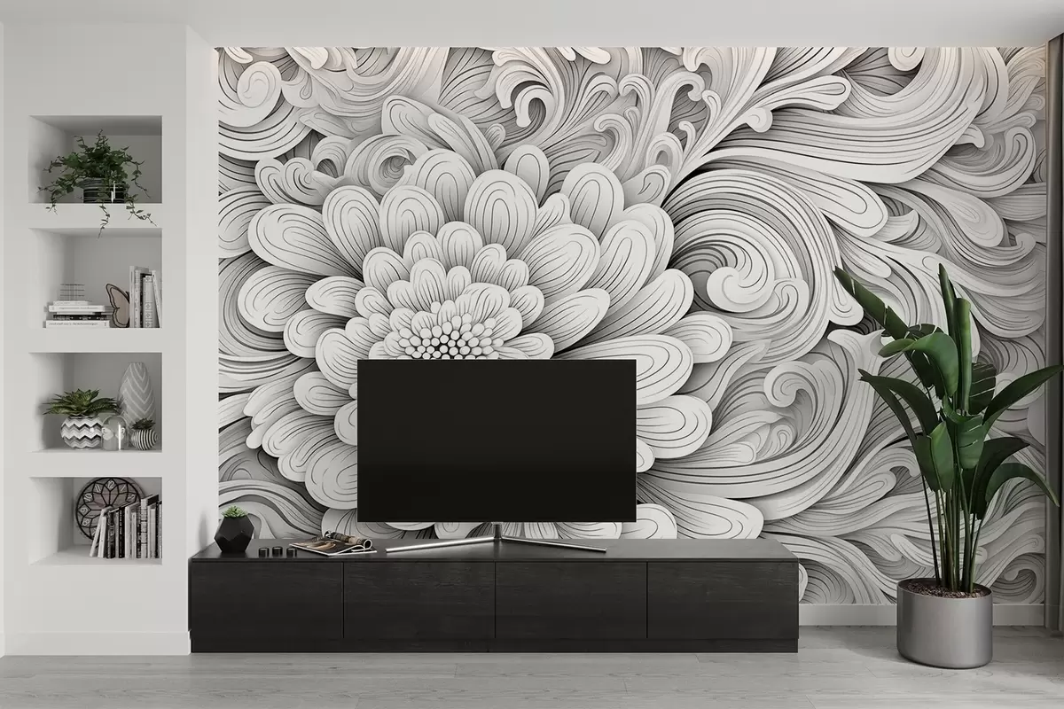 Τοιχογραφίες Διακοσμητικό ασπρόμαυρο μοτίβο σε σχήμα λουλουδιού και στροβίλων Nr. w09355
