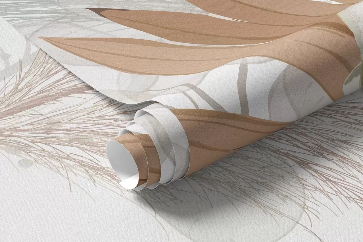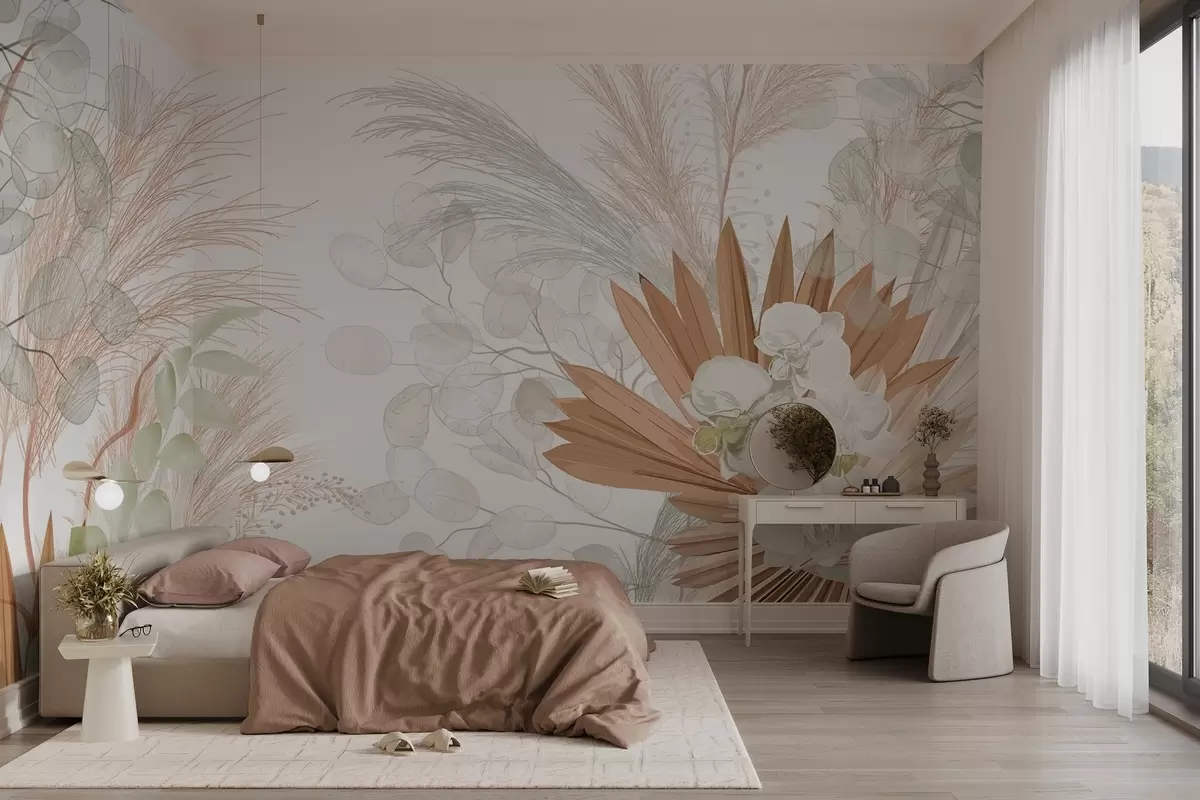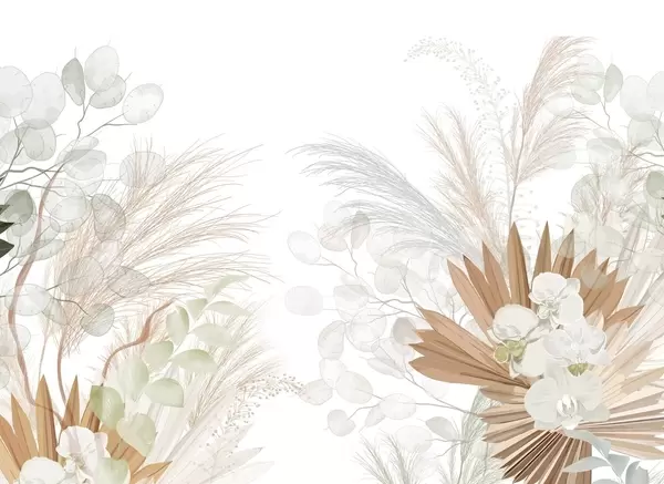 Τοιχογραφίες Χόρτο πάμπας, ευκάλυπτος, τροπικά φύλλα και ορχιδέες σε λευκό φόντο, παστέλ χρώματα Nr. w09366