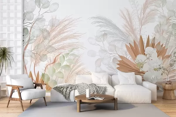 Τοιχογραφίες Χόρτο πάμπας, ευκάλυπτος, τροπικά φύλλα και ορχιδέες σε λευκό φόντο, παστέλ χρώματα Nr. w09366