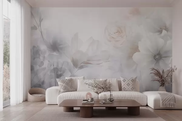 Τοιχογραφίες Μια λεπτή αφηρημένη ανθοσύνθεση με παστέλ ροζ τριαντάφυλλα και μανόλιες, απαλή εστίαση, ανοιχτό γκρι φόντο Nr. w09371