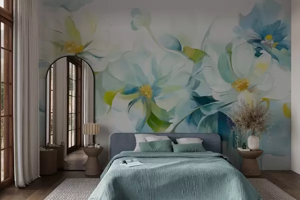 Τοιχογραφίες Αφηρημένα λευκά και μπλε λουλούδια με κίτρινα έμβολα και πράσινα φύλλα, σε λευκό φόντο, στυλ ζωγραφικής με υφή Nr. w09372