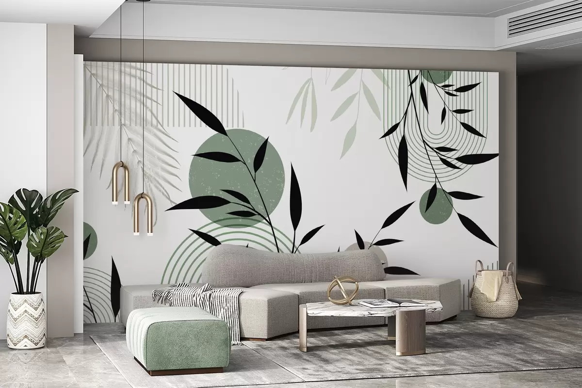 Τοιχογραφίες Αφηρημένη εκτύπωση με γεωμετρικά σχήματα, κύκλους και τόξα και μαύρα και πράσινα φυτά σε λευκό φόντο Nr. w09384