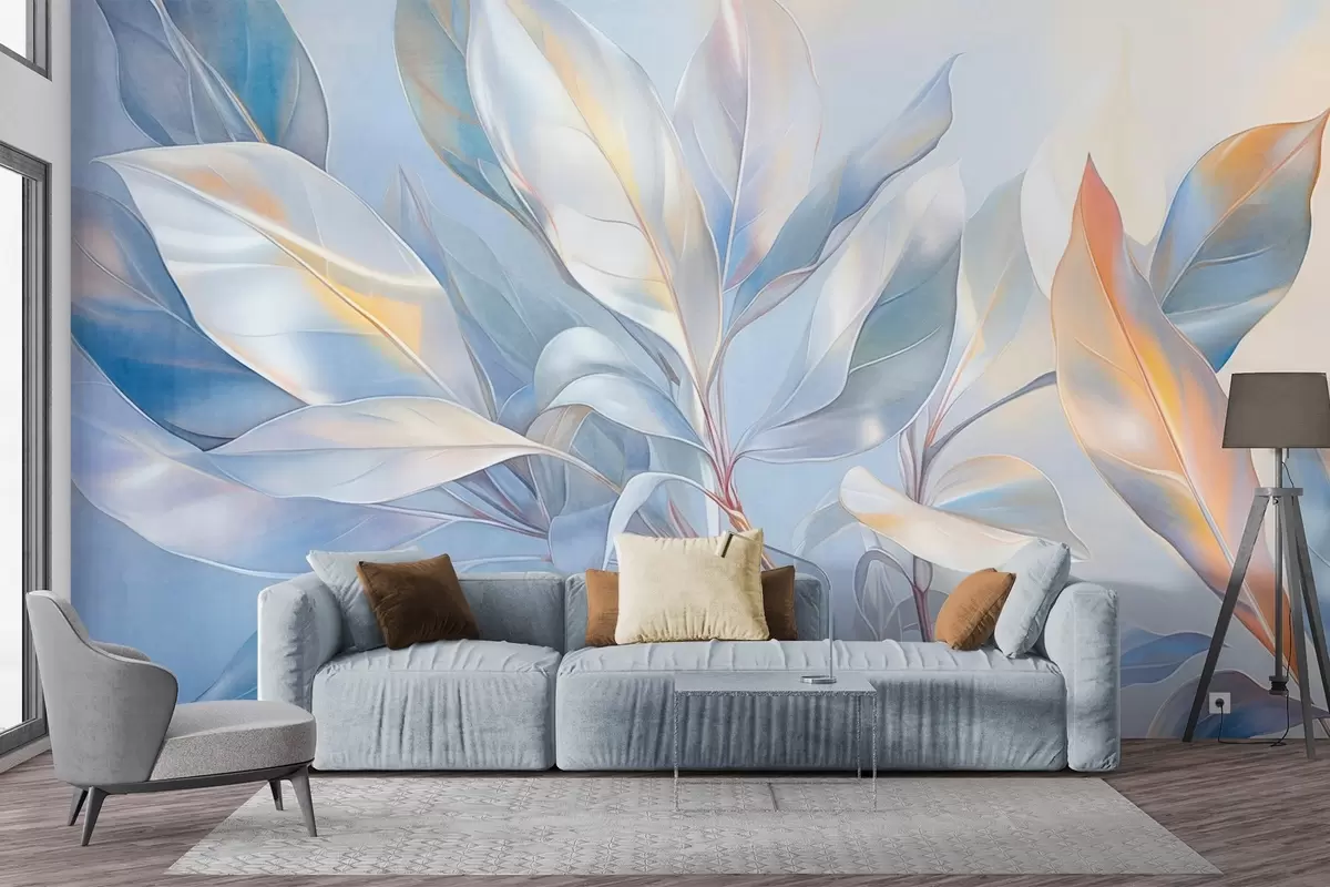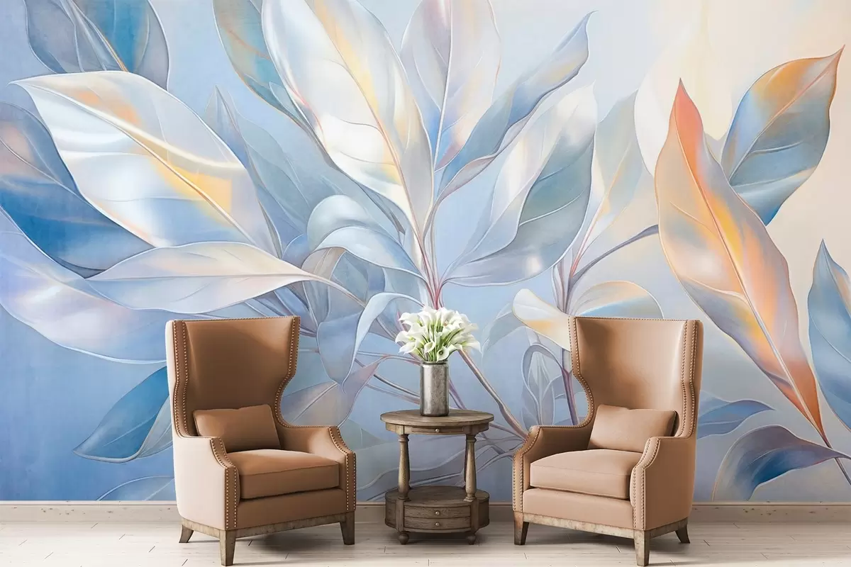 Τοιχογραφίες Φύλλα μανόλιας με λευκές και μπλε αποχρώσεις, απαλός φωτισμός, κομψή σύνθεση, λεπτομερείς φλέβες φύλλων, καλλιτεχνικές πινελιές Nr. w09385