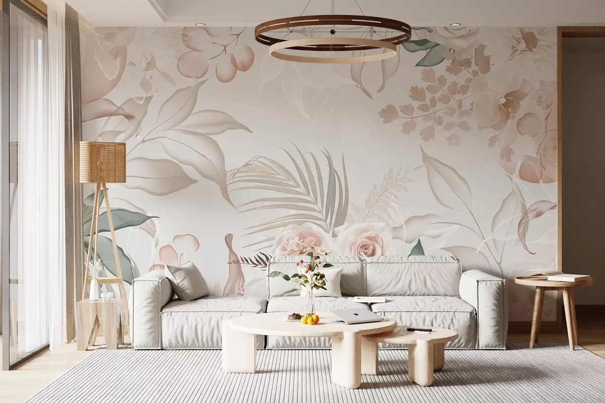 Τοιχογραφίες Λουλουδάτο σύνθεση με τριαντάφυλλα, ορχιδέες, ευκάλυπτο και φύλλα φοίνικα σε παστέλ χρώματα, με μπεζ φόντο Nr. w09393