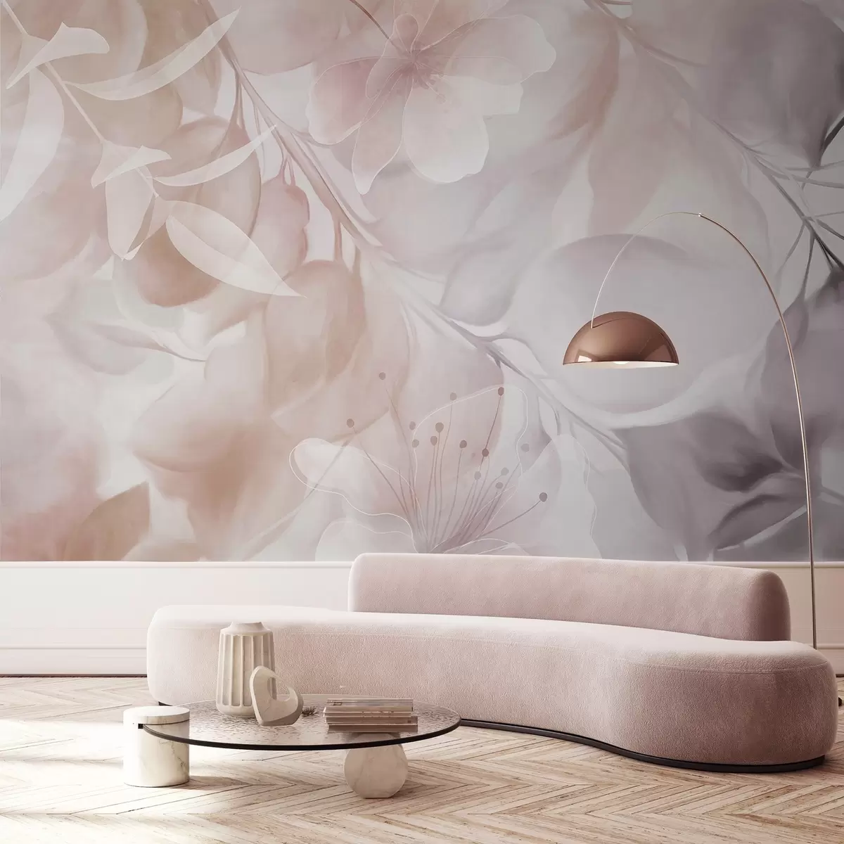 Τοιχογραφίες Λουλουδάτη τέχνη με απαλά μπεζ και καφέ λουλούδια, φύλλα και κλαδιά, απαλά παστέλ χρώματα, εφέ υφής ακουαρέλας Nr. w09397
