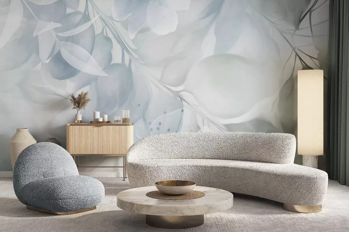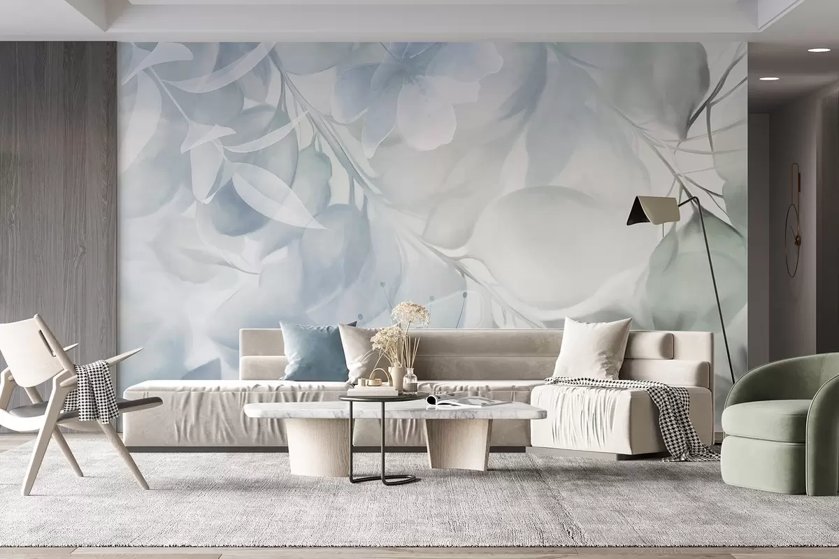 Τοιχογραφίες Λουλουδάτη τέχνη με απαλά μπλε και πράσινα λουλούδια, φύλλα και κλαδιά, απαλά παστέλ χρώματα, εφέ υδατογραφικής υφής Nr. w09397v1