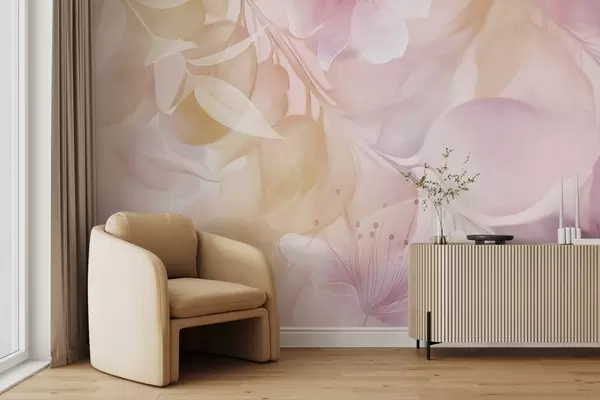 Τοιχογραφίες Λουλουδάτη τέχνη με απαλά κίτρινα και μοβ λουλούδια, φύλλα και κλαδιά, απαλά παστέλ χρώματα, εφέ υφής ακουαρέλας Nr. w09397v2