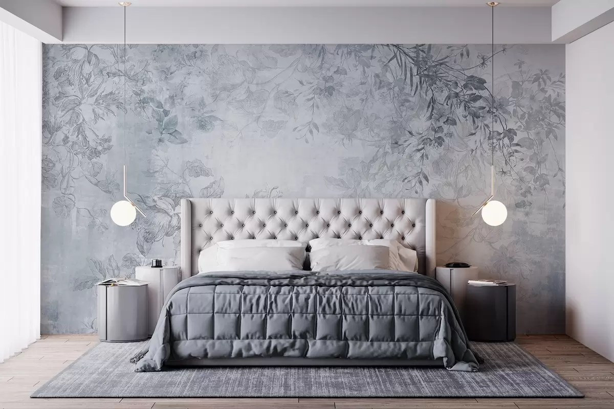 Τοιχογραφίες Vintage υφή floral τέχνη με σχέδιο στυλ λεπτεπίλεπτα λουλούδια κήπου και φύλλα εικονογραφήσεις, απαλά μπλε χρώματα Nr. w09402v1