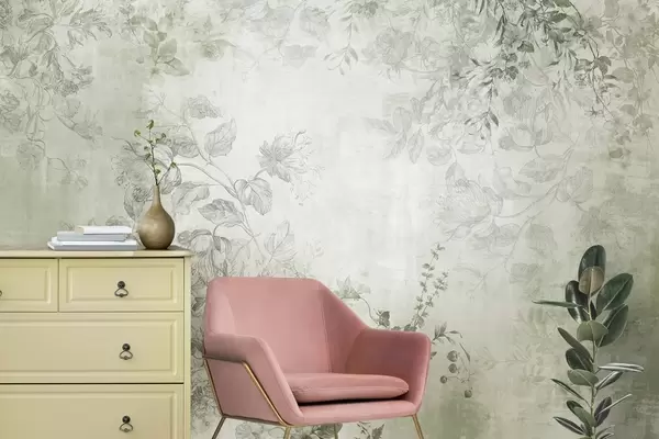 Τοιχογραφίες Vintage υφή floral τέχνη με σχέδιο στυλ λεπτή κήπο λουλούδια και φύλλα εικονογραφήσεις, απαλά πράσινα χρώματα Nr. w09402v2