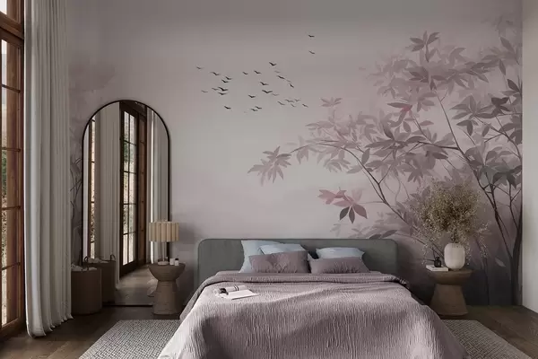Τοιχογραφίες Υφή τοπίου με δέντρα και σμήνος πουλιών που πετούν στον ουρανό, παστέλ χρώματα, φυσική σκηνή Nr. w09418v1