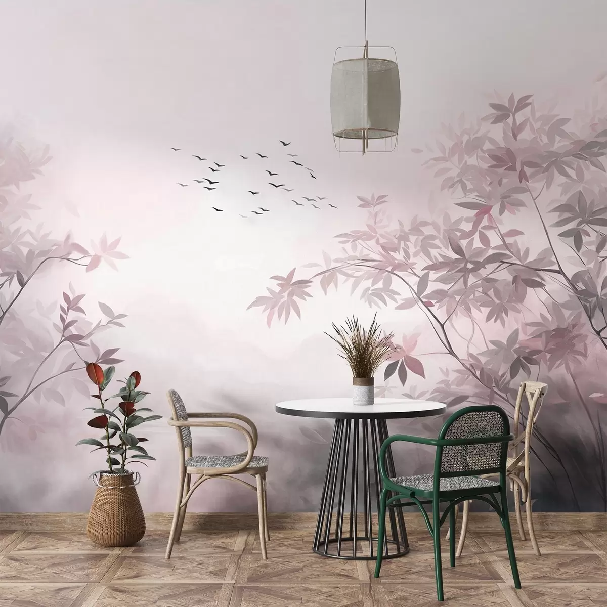 Τοιχογραφίες Υφή τοπίου με δέντρα και σμήνος πουλιών που πετούν στον ουρανό, παστέλ χρώματα, φυσική σκηνή Nr. w09418v1