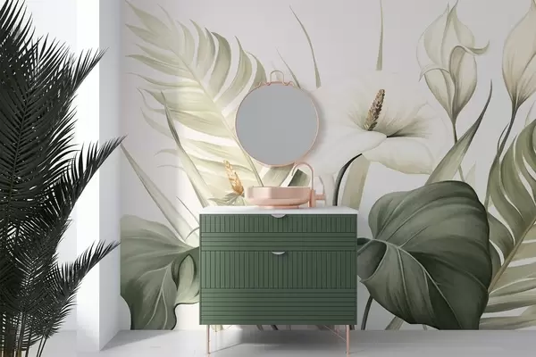 Τοιχογραφίες Λευκά κρίνα και πράσινα τροπικά φύλλα, βοτανική απεικόνιση, ανοιχτόχρωμο φόντο, vintage στυλ, υφή Nr. w09423