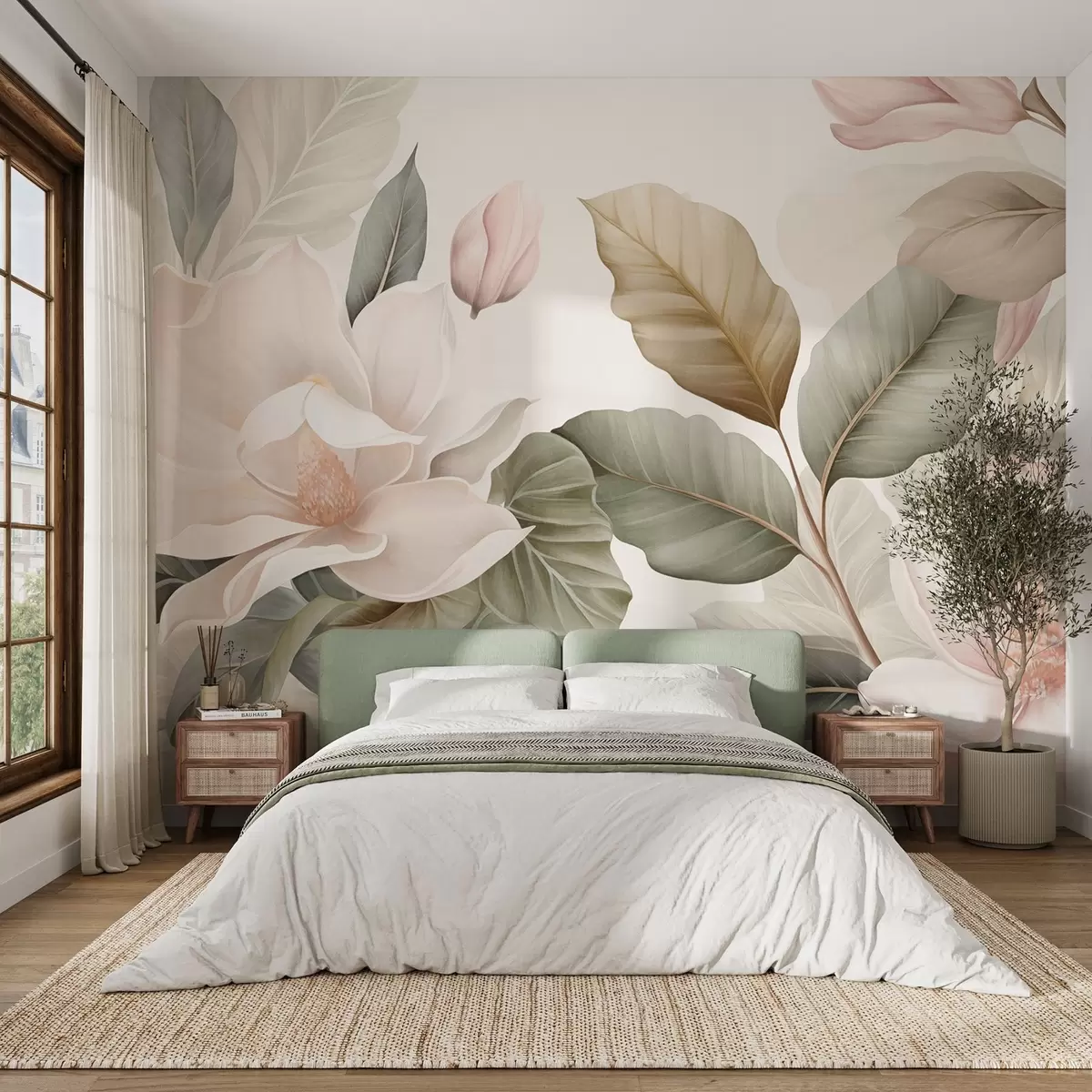 Τοιχογραφίες Λουλούδια μανόλιας με φύλλα σε παστέλ χρώματα, λευκό, ροζ και πράσινο, απαλά, ευαίσθητα, σε στυλ ακουαρέλας Nr. w09427