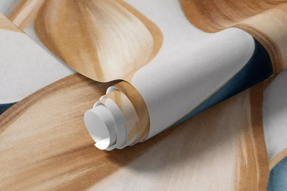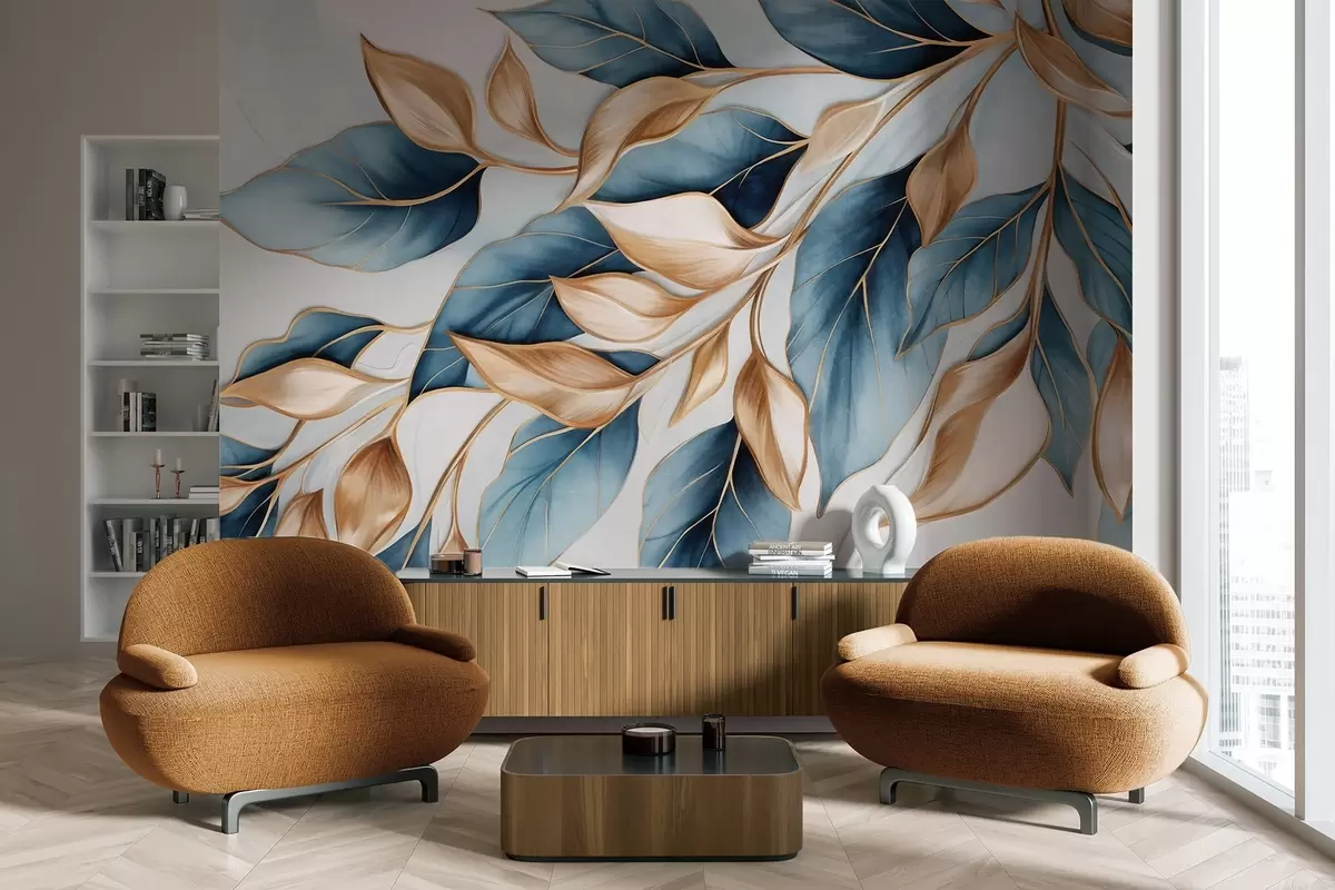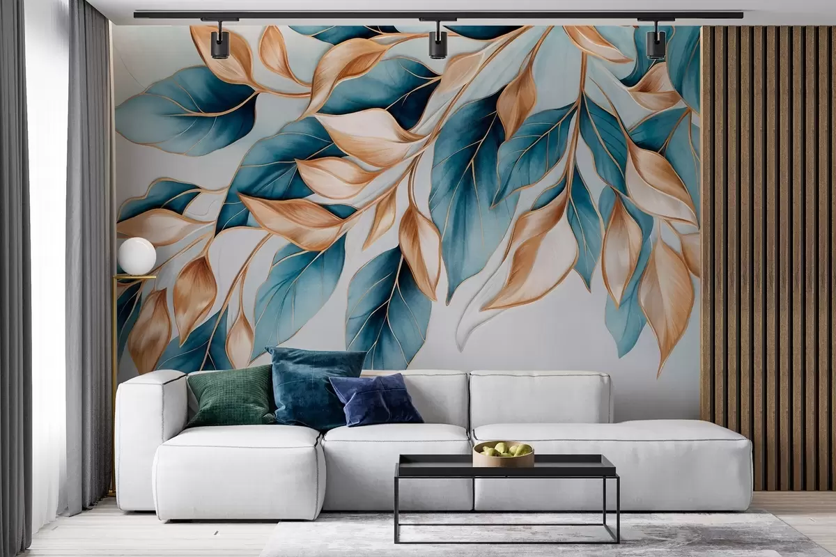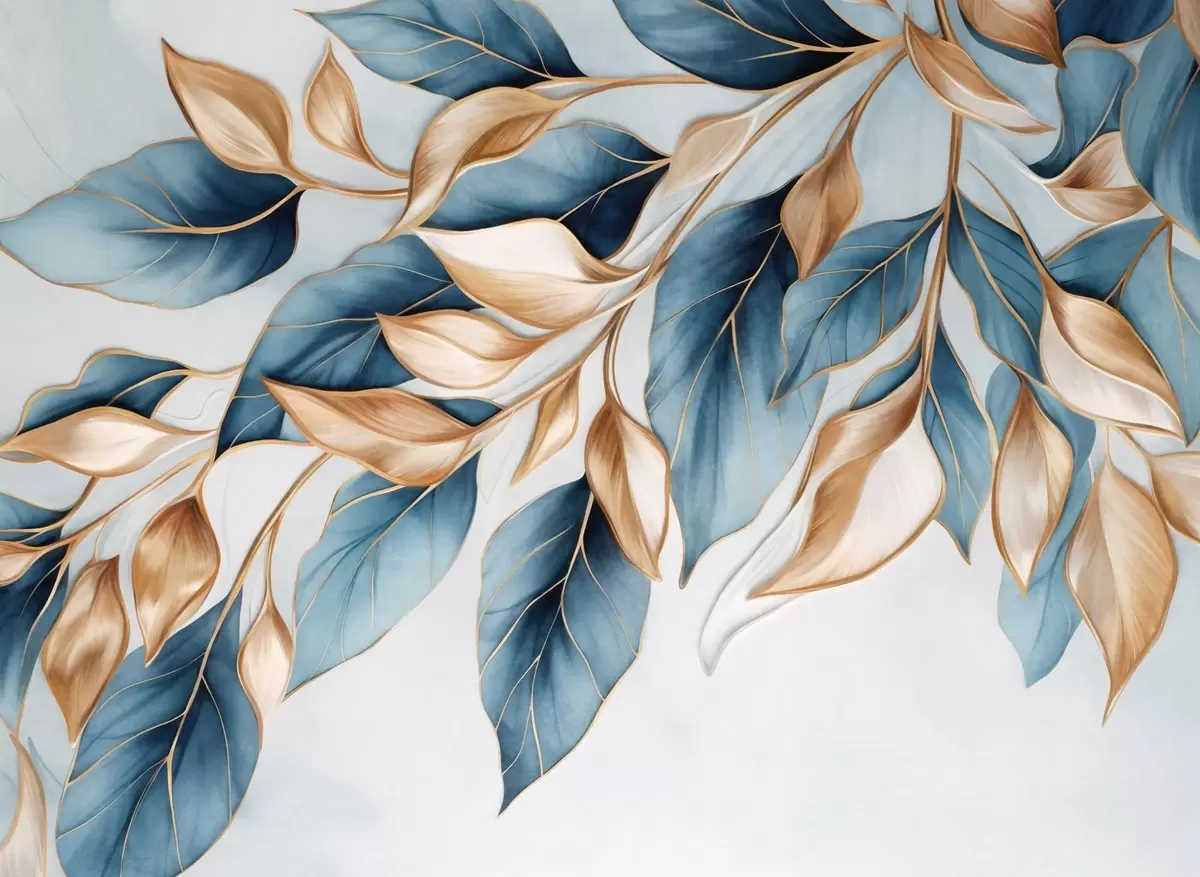 Τοιχογραφίες Φύλλα με υφή σε μπλε και πορτοκαλί χρώμα, ανοιχτό μπλε φόντο, κομψό και καλλιτεχνικό σχέδιο, μοντέρνο στυλ Nr. w09429