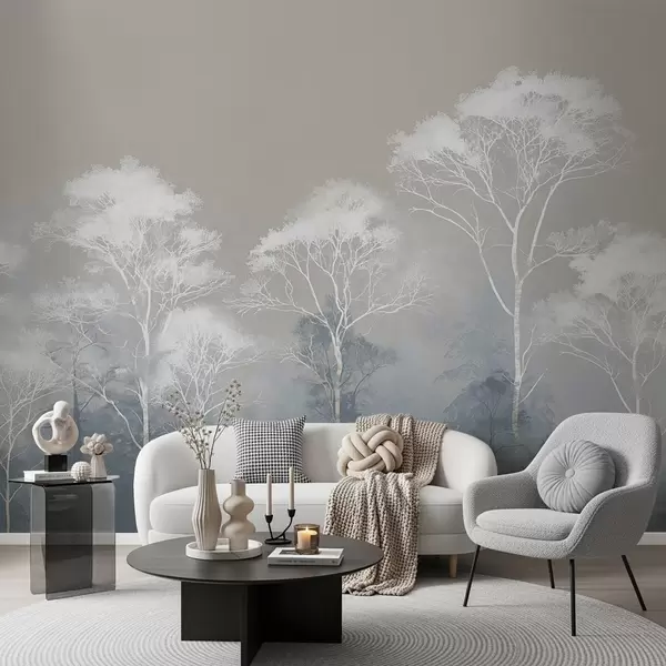 Τοιχογραφίες Μινιμαλιστικά δέντρα σε μπλε-γκρι παλέτα, μέσα στην ομίχλη Nr. w09448
