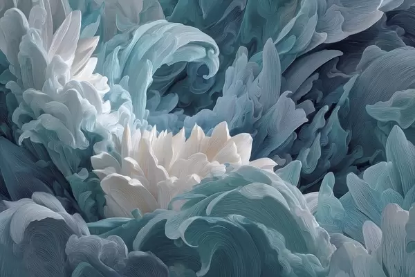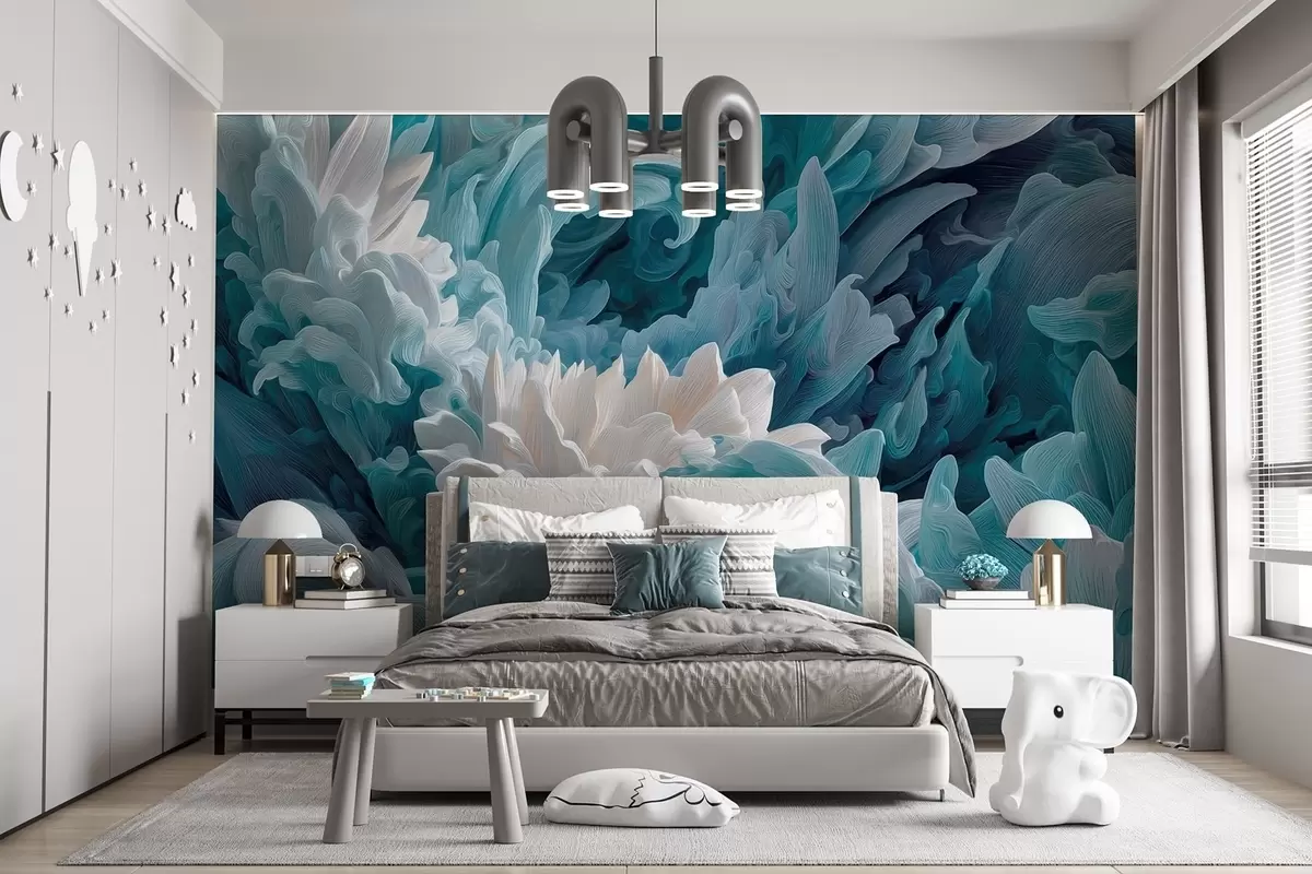 Τοιχογραφίες Χορός από πέταλα και κύματα του ωκεανού σε μπλε αποχρώσεις Nr. w09454