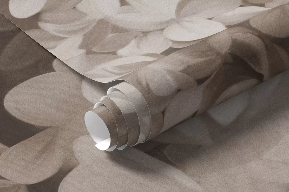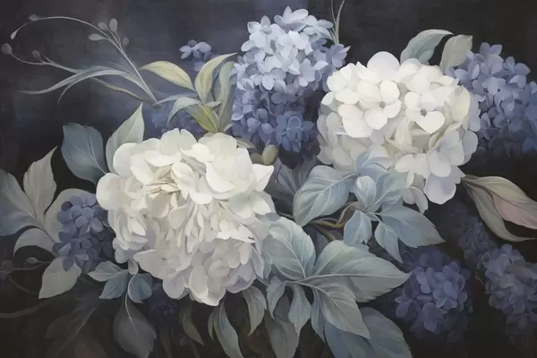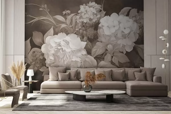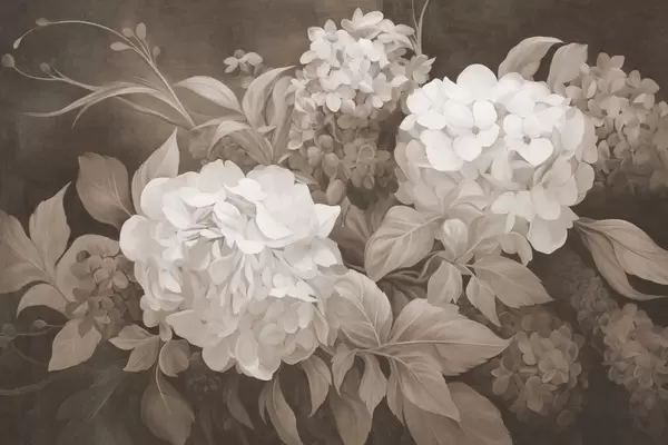 Τοιχογραφίες Τεχνητή ζωγραφική σε σέπια με υφή, που απεικονίζει ορτανσίες με μεγάλα φύλλα, αφηρημένο και σκούρο φόντο Nr. w09465