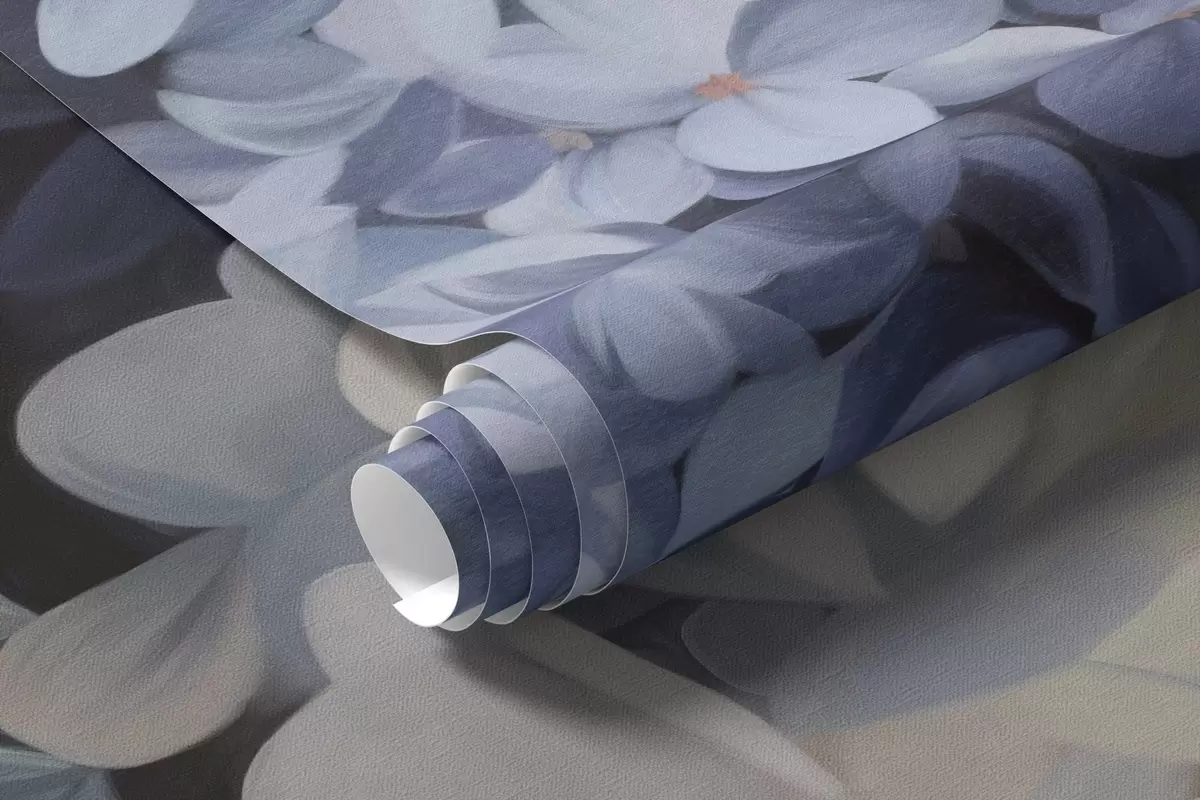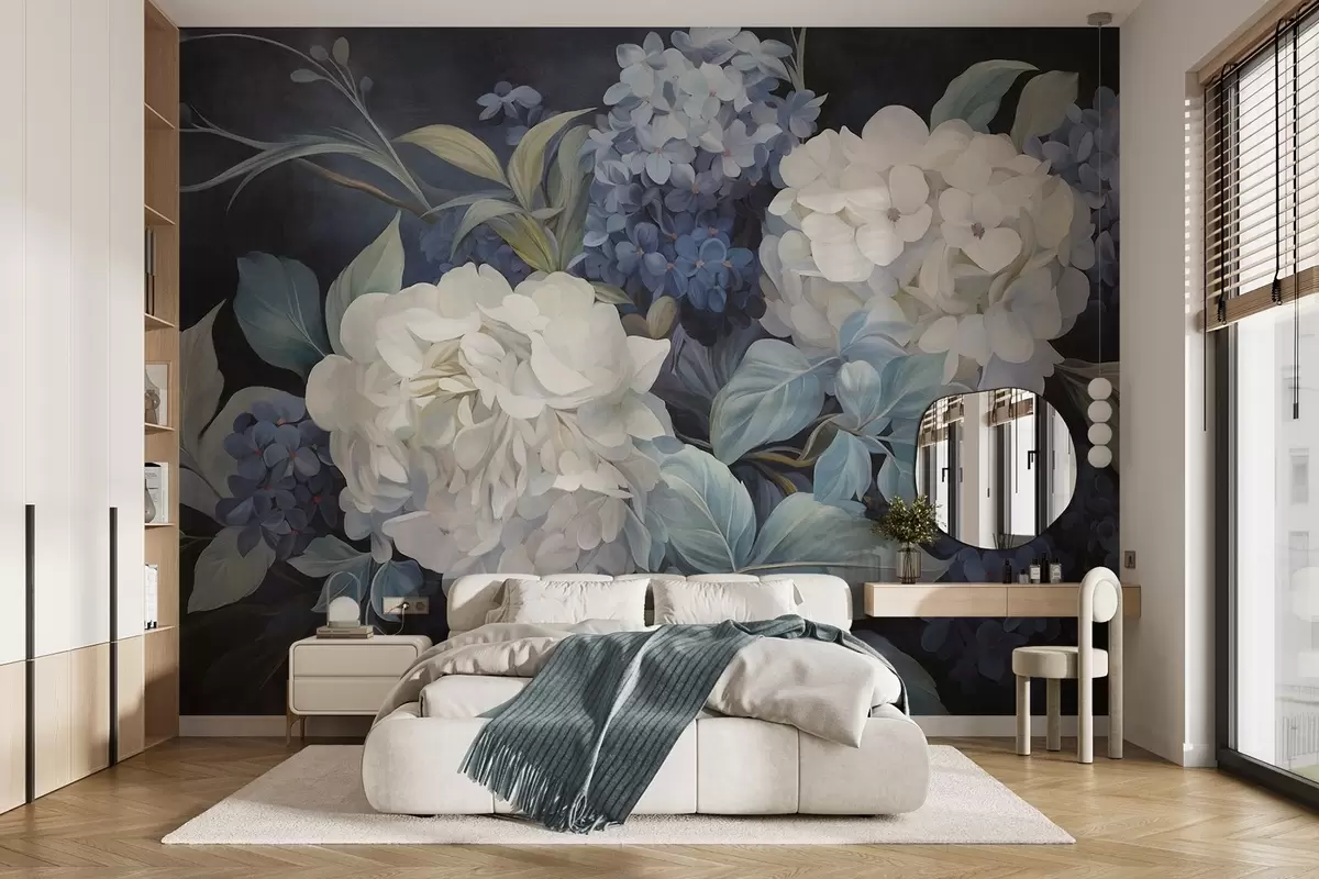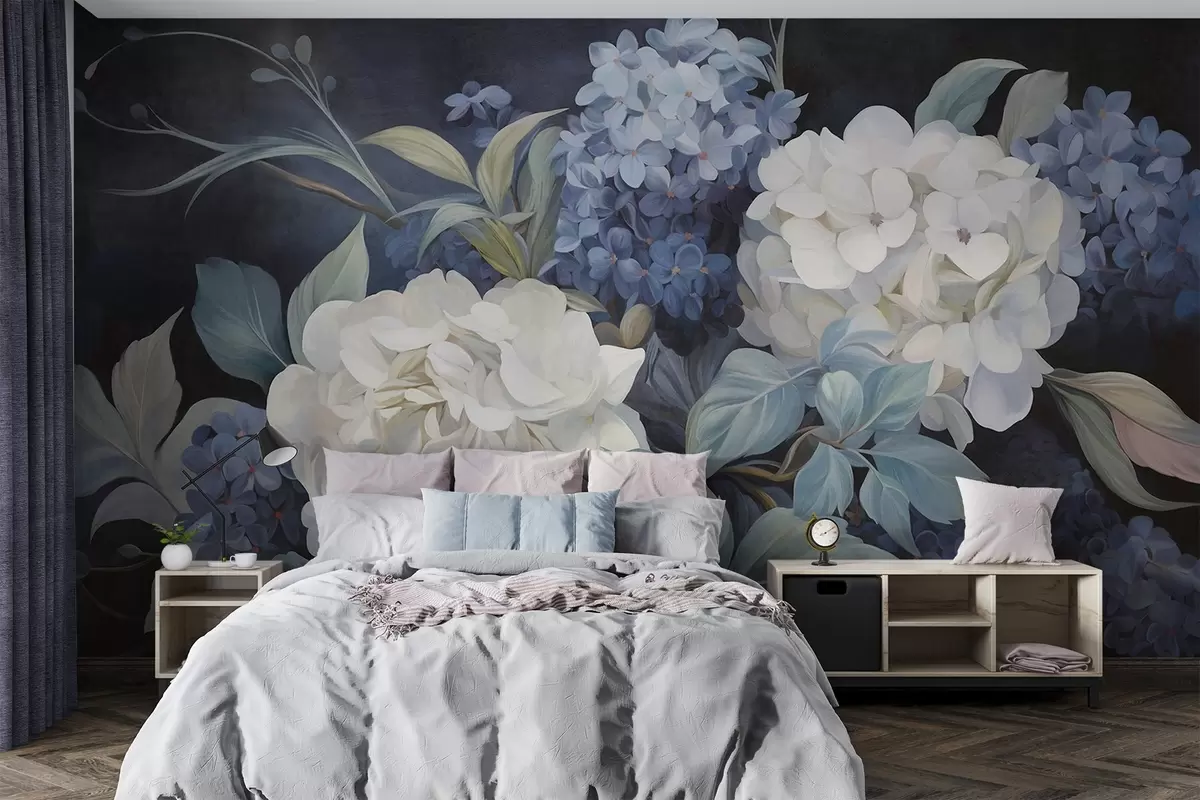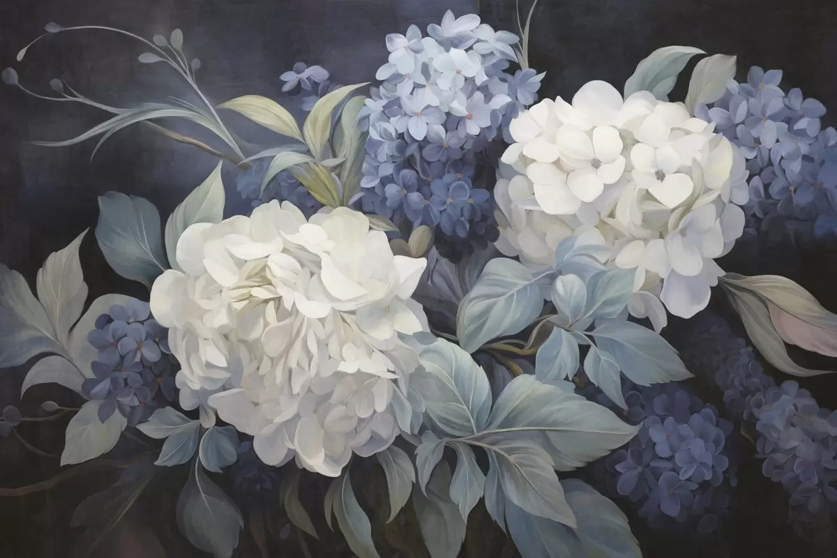 Τοιχογραφίες Τεχνητή ζωγραφιά σε σκούρο μπλε χρώμα με υφή, που απεικονίζει άνθη ορτανσίας με μεγάλα φύλλα, σε αφηρημένο και σκούρο φόντο Nr. w09465v1