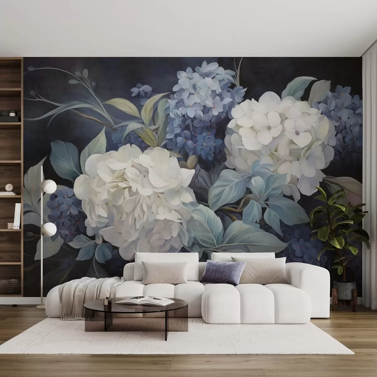 Τοιχογραφίες Τεχνητή ζωγραφιά σε σκούρο μπλε χρώμα με υφή, που απεικονίζει άνθη ορτανσίας με μεγάλα φύλλα, σε αφηρημένο και σκούρο φόντο Nr. w09465v1