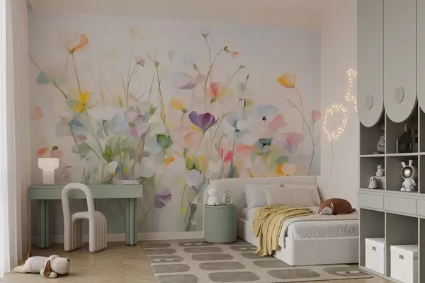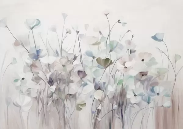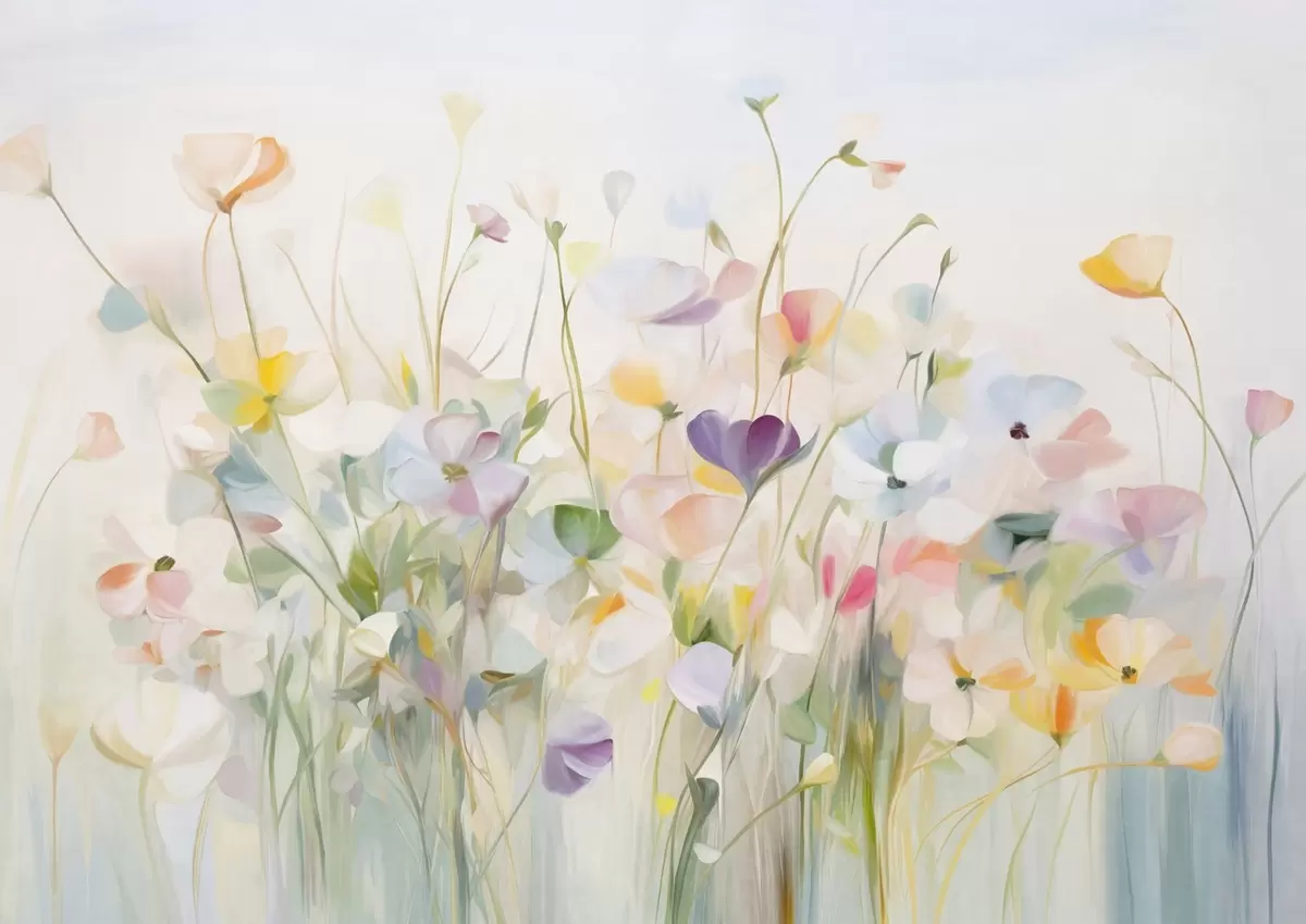 Τοιχογραφίες Αφηρημένο πεδίο με πολύχρωμα λουλούδια με μακριά στελέχη και πράσινα φύλλα, υφή, παστέλ, ανοιχτά χρώματα Nr. w09466