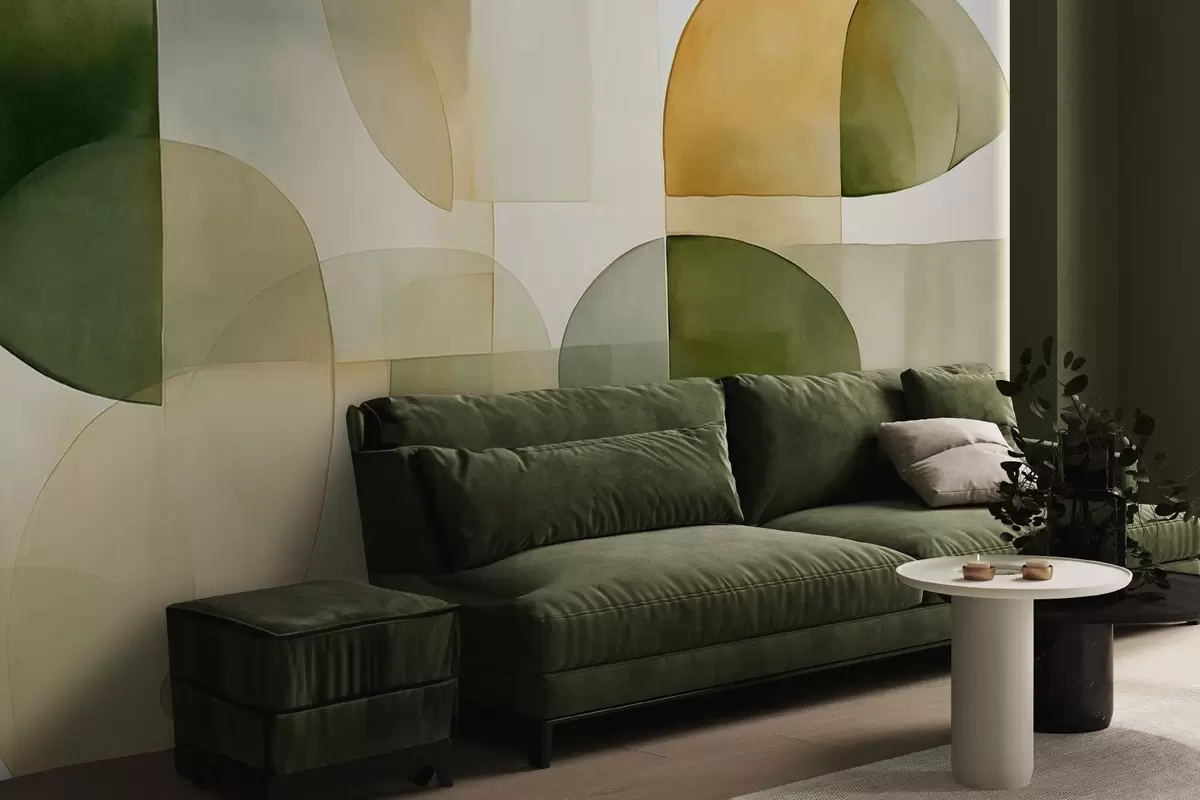 Τοιχογραφίες Αφηρημένα σχήματα με υφή σε αποχρώσεις του πράσινου και του κίτρινου, απαλοί τόνοι, μινιμαλιστική σύνθεση, ουδέτερο φόντο Nr. w09467