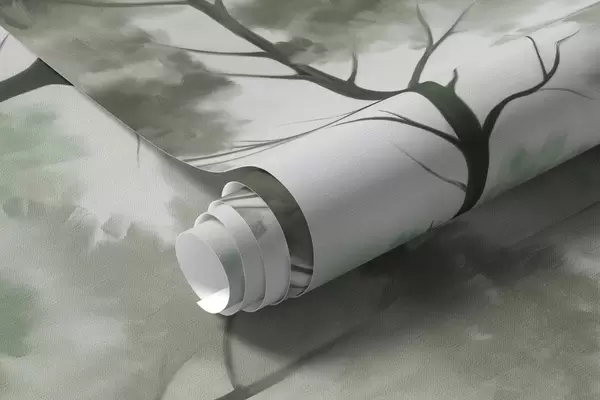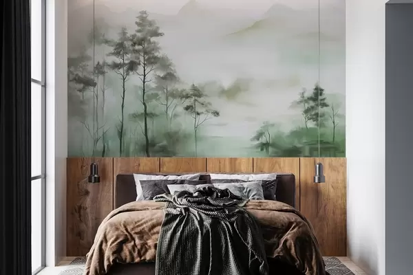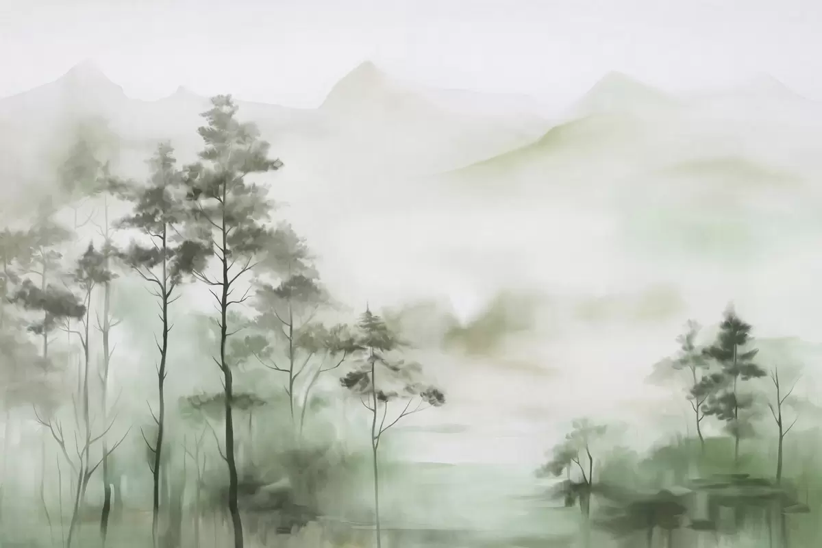 Τοιχογραφίες Ομιχλώδες τοπίο με ψηλά δέντρα και βουνά σε απαλούς τόνους του πράσινου και του γκρι, μινιμαλιστικό στυλ, υφή Nr. w09469