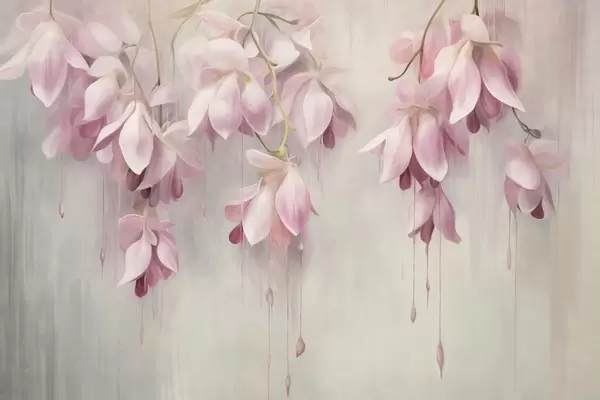 Τοιχογραφίες Κρεμαστά ροζ λουλούδια, ανοιχτό γκρι φόντο, σύνθεση με floral υφή, βοτανική τέχνη, παστέλ χρώματα Nr. w09471