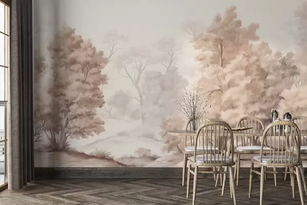 Τοιχογραφίες Ζωγραφική με υφή που μιμείται ένα δάσος με ψηλά δέντρα και γρασίδι, απαλά και ήρεμα χρώματα, γαλήνια σκηνή Nr. w09474