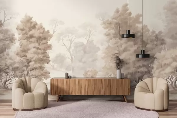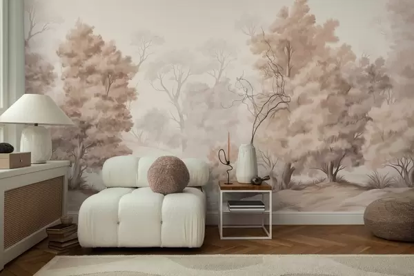 Τοιχογραφίες Ζωγραφική με υφή που μιμείται ένα δάσος με ψηλά δέντρα και γρασίδι, απαλά και ήρεμα χρώματα, γαλήνια σκηνή Nr. w09474