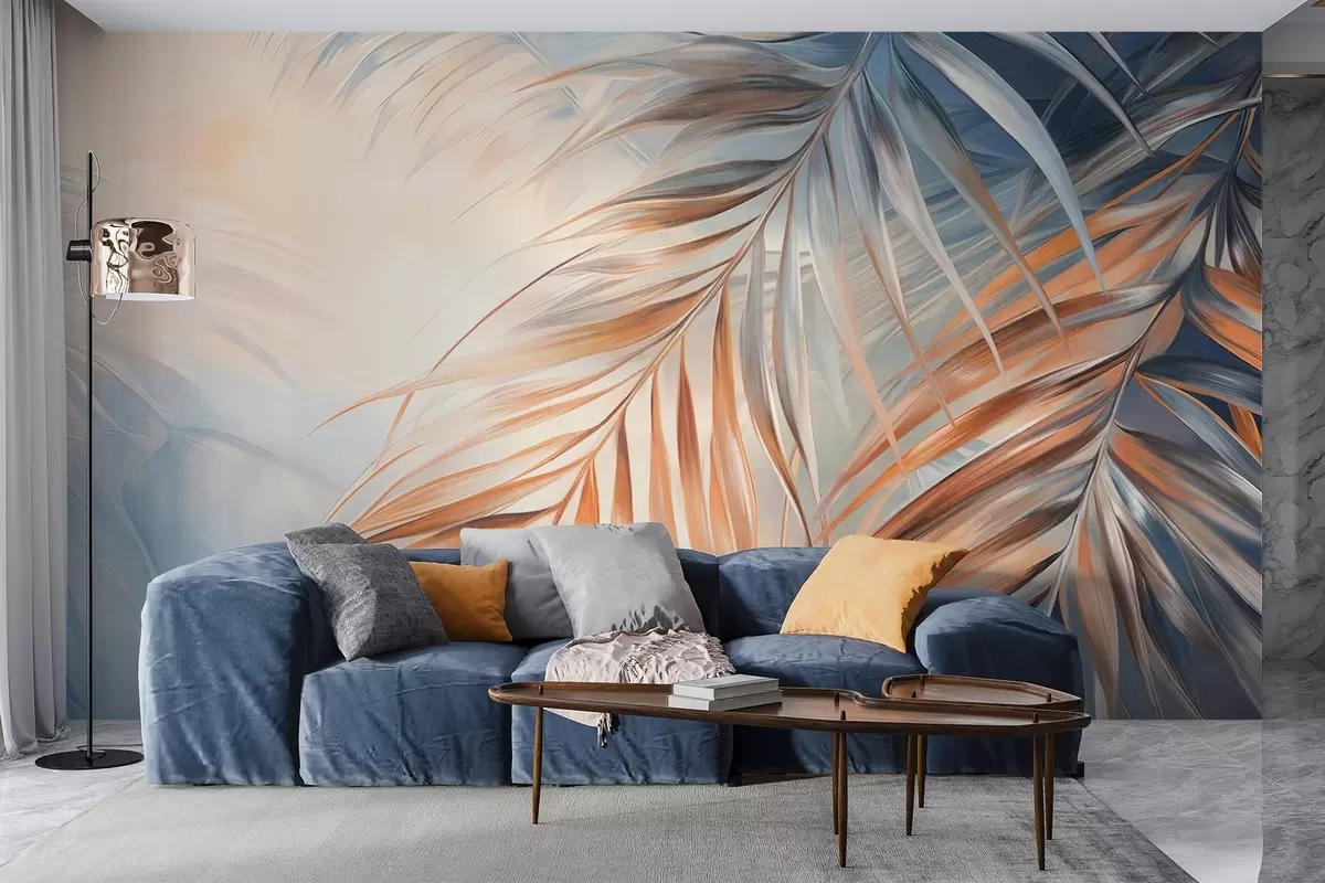 Τοιχογραφίες Φύλλα φοίνικα με πορτοκαλί και μπλε αποχρώσεις, φόντο με ελαφριά υφή και απαλά χρώματα, κομψό τροπικό στυλ Nr. w09475