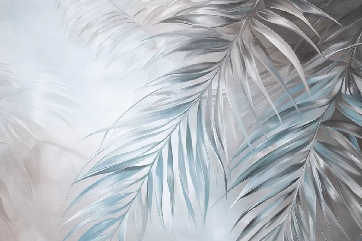 Τοιχογραφίες Φύλλα φοίνικα με γκρι και μπλε αποχρώσεις, φόντο με ελαφριά υφή και απαλά χρώματα, κομψό τροπικό στυλ Nr. w09475v1