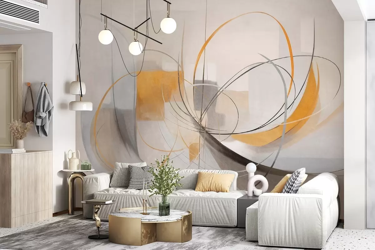 Τοιχογραφίες Αφηρημένο μοντέρνο ζωγραφικό στυλ με καμπύλες γραμμές και γεωμετρικά σχήματα σε αποχρώσεις του γκρι, του λευκού και του πορτοκαλί Nr. w09476