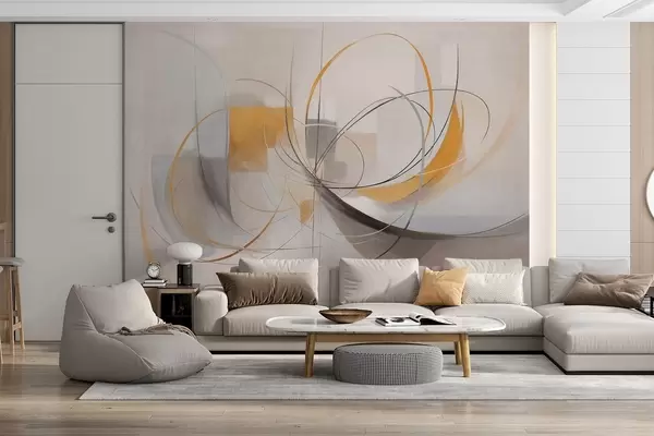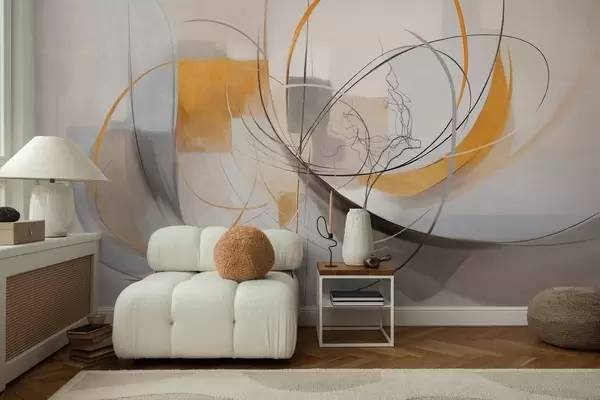 Τοιχογραφίες Αφηρημένο μοντέρνο ζωγραφικό στυλ με καμπύλες γραμμές και γεωμετρικά σχήματα σε αποχρώσεις του γκρι, του λευκού και του πορτοκαλί Nr. w09476