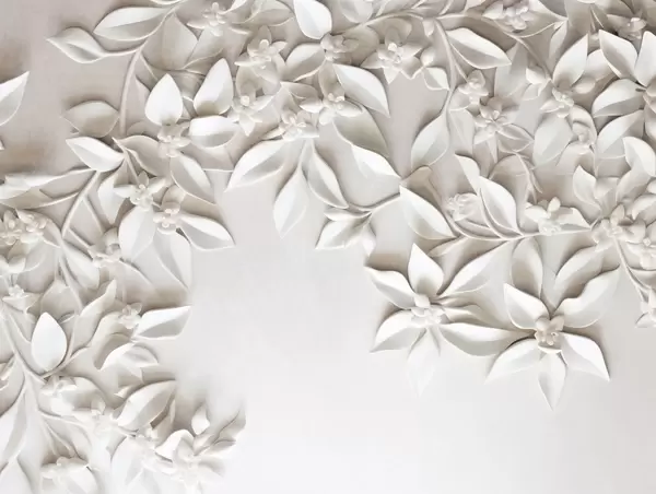 Τοιχογραφίες Λευκά λουλούδια και φύλλα με υφή, ανθοσύνθεση, κομψό σχέδιο, μινιμαλιστικό στυλ, διακοσμητική τέχνη Nr. w09479